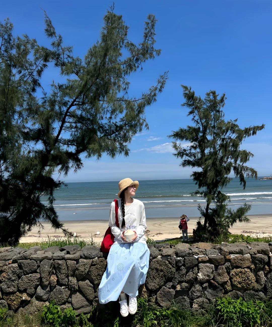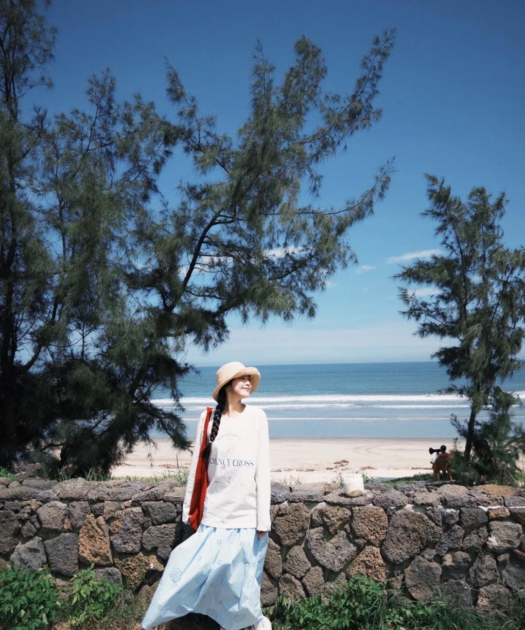 宽松白色T恤配小蓝裙远比你想象中好看! 夏季出游可以选择这种长袖的轻薄T恤,字母Logo的设计增加休闲感。 搭配一条蓝色的及踝长裙,蓝白组合清新温柔。小姐姐还搭配了一只红色的包包,更加时尚有活力,拍照时也超有氛围感。