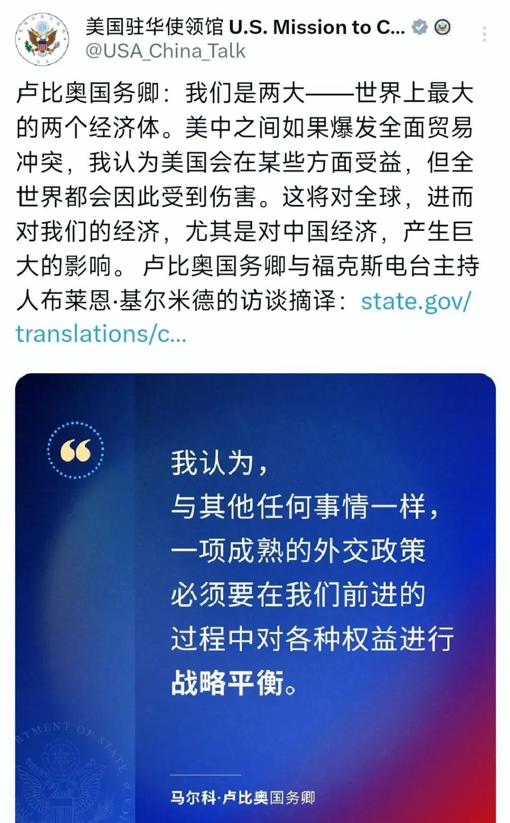 美国驻华使领馆今天下午(8月4日)写道:“鲁比奥国务卿:我们是两大——世界上最大