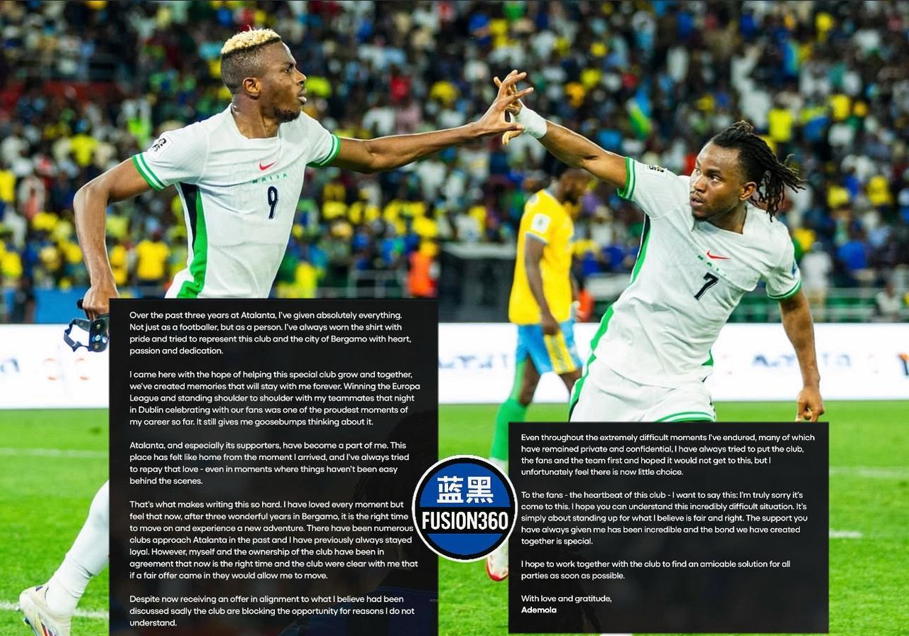 【卢克曼公开炮轰亚特兰大,正式递交转会申请】 三年倾心效力,赢得欧联杯荣誉,卢克曼亲笔发文怒斥俱乐部“违背承诺、对人不公”,称即使收到符合约定的报价,亚特兰大仍阻止其离队。 尼日利亚国脚强调已“忍无可忍”,在多次沟通无果后正式递交转会申请。他向球迷表达歉意,并希望尽快与俱乐部找到和平解决方案。