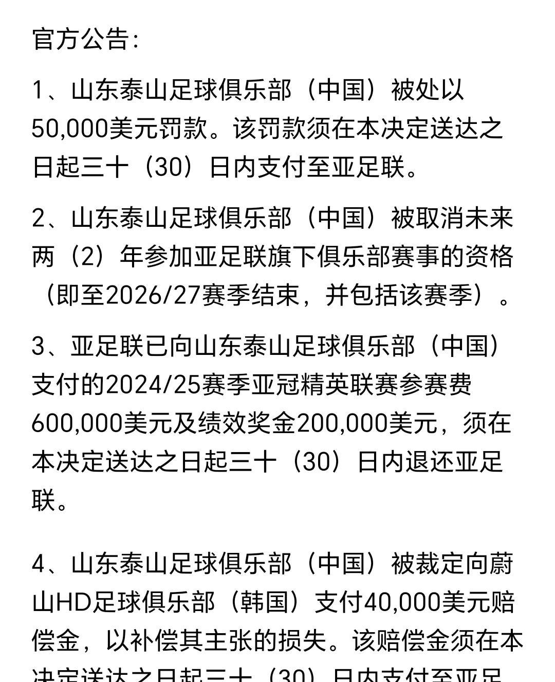 该来的终于还是来了,泰山队被亚足联禁赛两年,罚款5万美元,加上之前的一系列罚款,