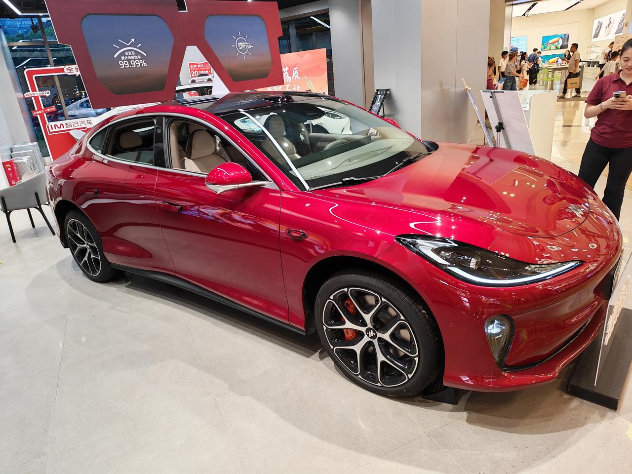 今天商场里摆出的是max+版本,改装了大轮毂 优点:确实漂亮,侧看,正看都有行云流水一样的感觉,马蒂斯红颜色很正,外观我竖大拇指,内饰颜色也不错只是不知道耐不耐脏,方向盘握感可以 个人感受下来的缺点,不喜勿喷:打开车门,准备坐进驾驶室,抬脚发现座舱离地高度很高,我印象中试驾的其他车没有那么高,这一下子还不习惯,座椅偏舒适包裹感不足,本人身高175坐进后排,空间足够但是大腿下面有悬空座椅不够长,头部空间一拳不足了 等有空试驾一下后再给出动态评价