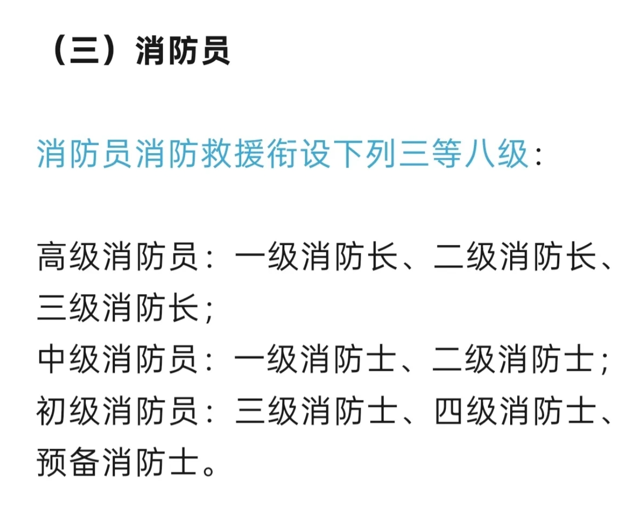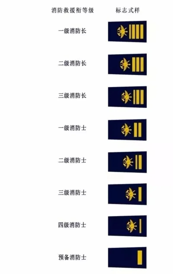 中国的消防救援衔共有三等八级,高级消防员有3级,中级消防员有2级。