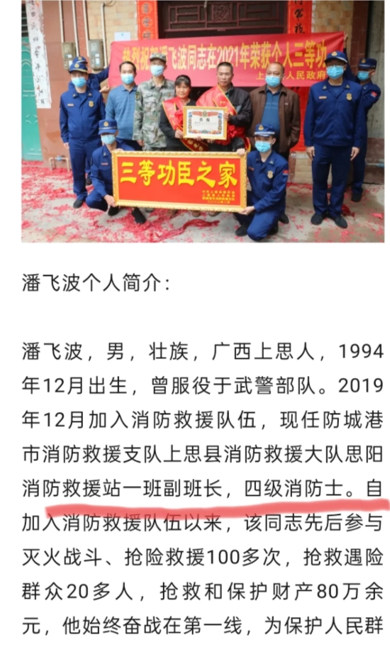 如果是城市消防队,二级消防士就是中层骨干;但是亮证姐老公是“防城港市上思县某镇消防救援站二级消防士”。
