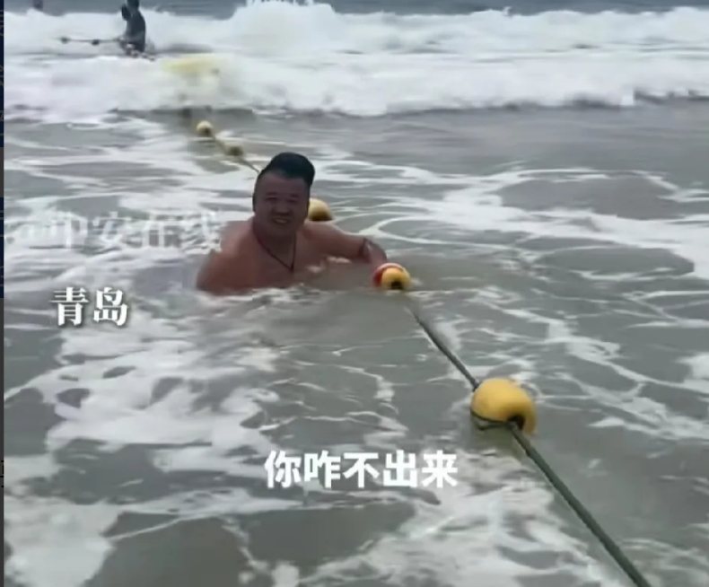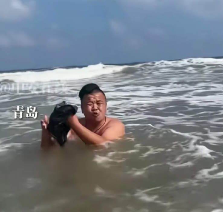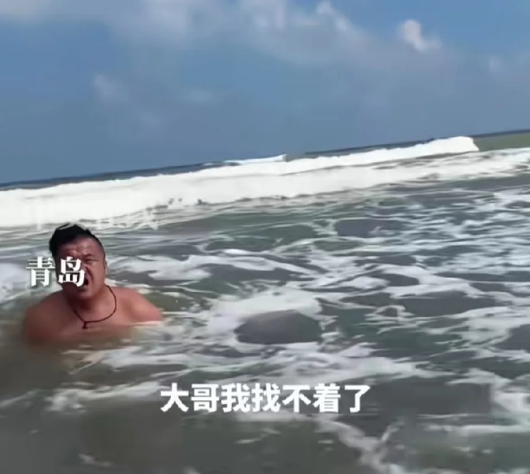 尴尬啊!山东青岛,男子下海游泳,不料裤衩被冲跑。妻子帮忙寻找无果,把自己帽子扔给男子遮挡。网友: 中年男人的裤衩经不起大风浪!