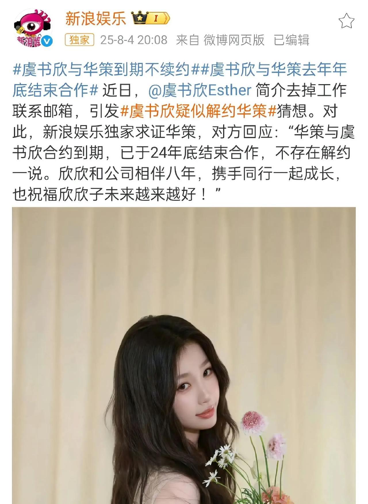昨天看到娱乐新闻,虞书欣和华策的签约到期不续了,公司也发文祝福虞书欣未来越来越好