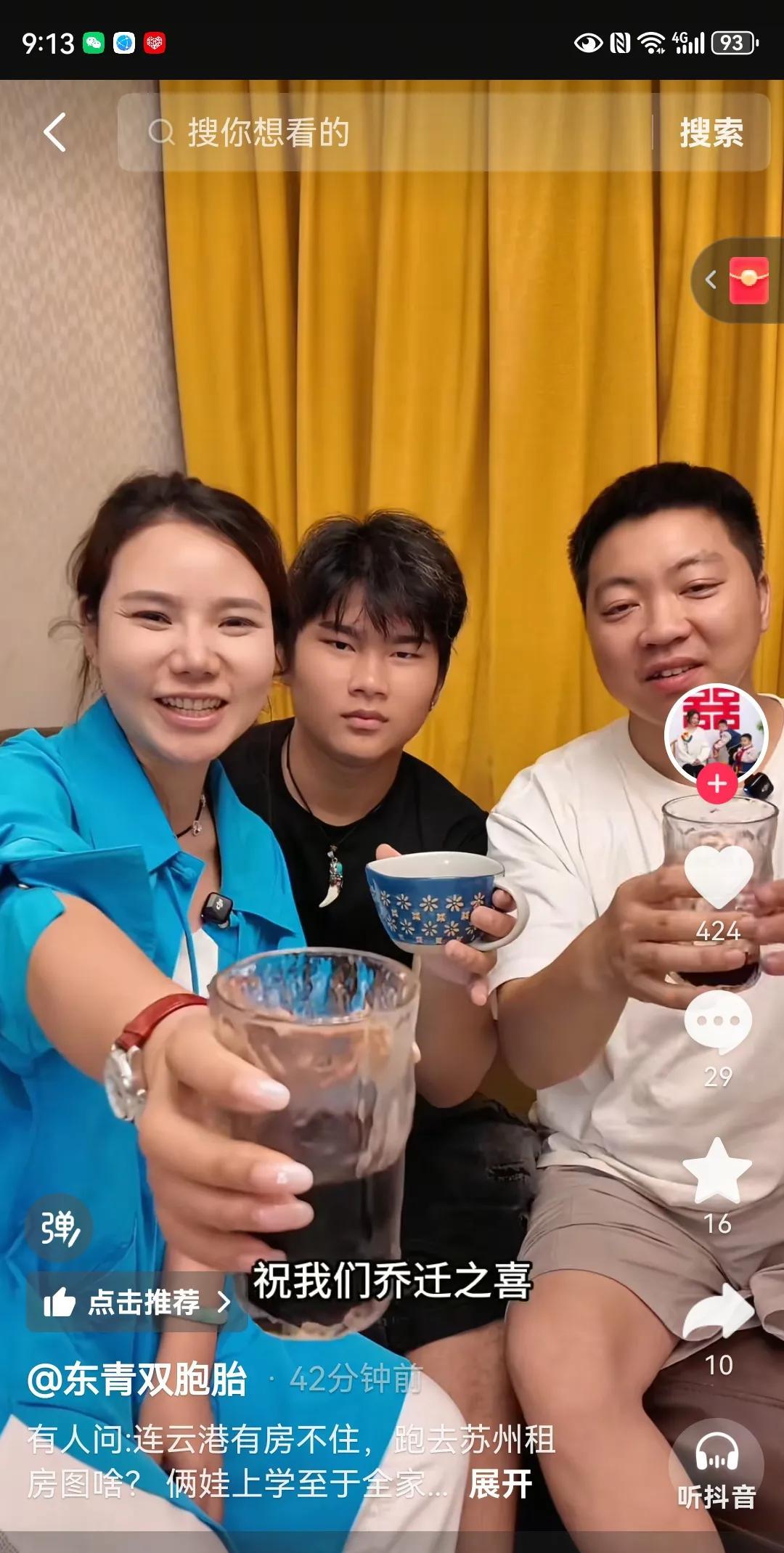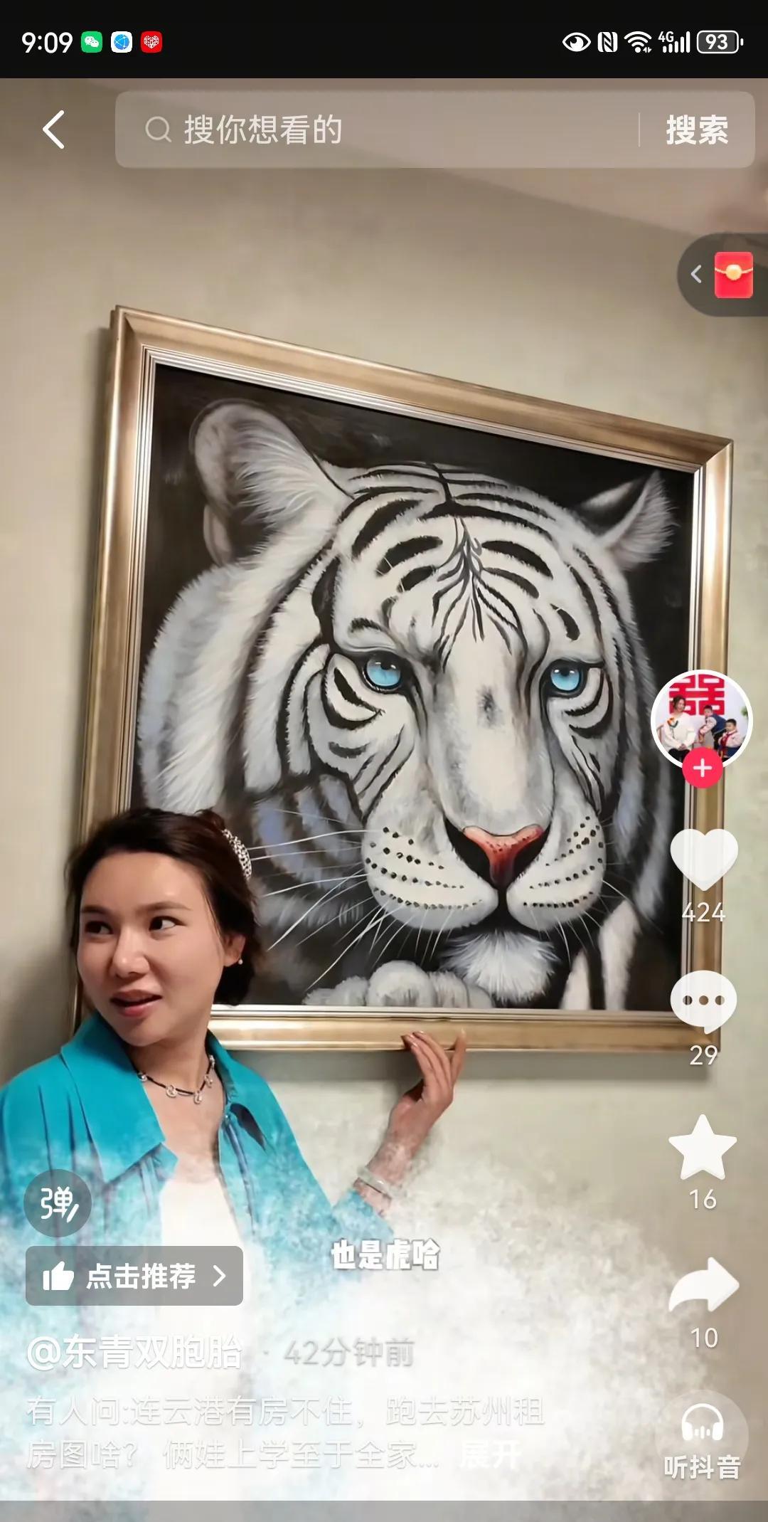 二姐一家三口搬到苏州,又一次乔迁之喜。 到地方天黑了,二姐安排老公和儿子去搬东西,她在家做晚饭,还让他俩点菜。结果没多久,外卖到了,看样子他们家以后会以外卖,半成品,预制品为主,二姐肯定是很乐意的,但双胞胎长期那样吃,不知道啥都亲力亲为特别注重饮食健康的婆婆会不会放心。 二姐属虎,他们租住的房子卧室墙上就挂了一幅老虎的画像,还是很凶猛的白虎,是巧合还是故意而为之? 二姐的文案看手笔应该是出自小老公,里面特意提到李子昂是前夫的儿子。评论区很多人玻璃心了,觉得不应该那样说,没把他当成家人,很见外的感觉。但是,事实就是如此呀!儿子判给了前夫,由爷爷奶奶养大,二姐再婚多年,去年把儿子带进现夫的家里。那一家一开始就没接受他,结婚孩子都不知道,要不是后面的变故,根本就没机会进那家门,还想别人视他为家人,可能吗?