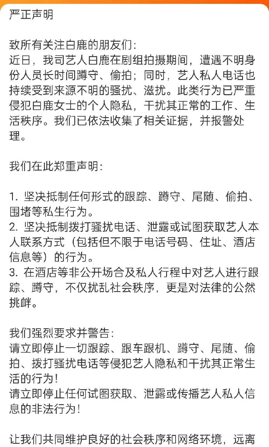 凌晨四点收工三小时被电话骚扰三次。 白鹿工作室选择报警处理简直太解气了。 白鹿在剧组拍摄期间,遭私生饭全方位骚扰。长期蹲守片场偷拍,干扰拍摄秩序;甚至潜入酒店同层,试探着按她的门铃。 更过分的是,她的私人电话再凌晨被反复拨打。粉丝们痛心指出,白鹿团队安保薄弱,此前私生问题多次反映却未解决 ,而这次骚扰更是让长期受睡眠困扰的白鹿雪上加霜。 好在,白鹿工作室最终选择报警,声明中表态,斥责这些行为是对法律的公然挑衅。目前警方已介入调查,工作室也在紧急排查。 这件事曝光后,网友们纷纷谴责私生饭,说他们的行为已经远远超出了正常追星的范围,完全是病态、疯狂的表现。 有此遭遇的不知白鹿一人。明星也是人,他们有自己的空间和隐私,希望这次能给私生饭一个狠狠的教训,也给整个娱乐圈敲响警钟,让明星们能安心工作、生活。#白鹿# #白鹿片场# #人气演员白鹿# #白鹿神图#