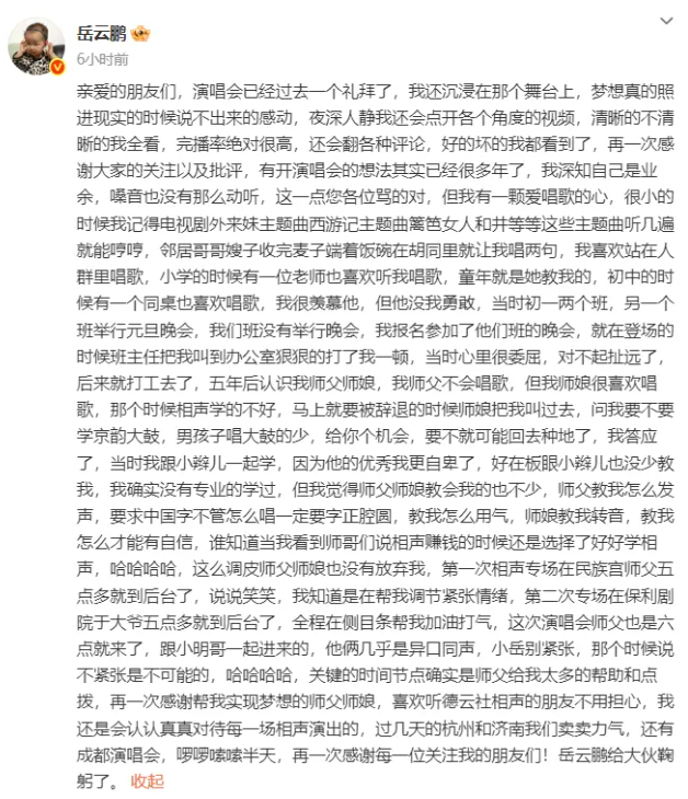 近日,岳云鹏因为开演唱会,从相声演员跨界当歌手等问题引起争议。8月5日,岳云鹏发文回应,坦言自己是业余歌手,嗓音也不算动听,“您各位骂得对,但我有一颗爱唱歌的心。” 同时他也让喜欢听相声的观众放心,表示后续仍会认真对待每一场相声演出。