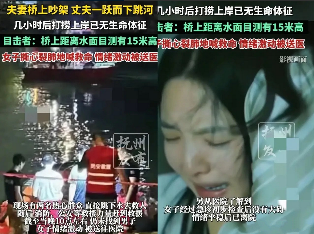 当晚两人走到桥上再次争执,争吵越来越激烈,言语冲突中丈夫情绪失控,毫不犹豫地翻过栏杆跳了下去!任凭妻子在桥上痛哭呼喊,再也换不回他的回应。