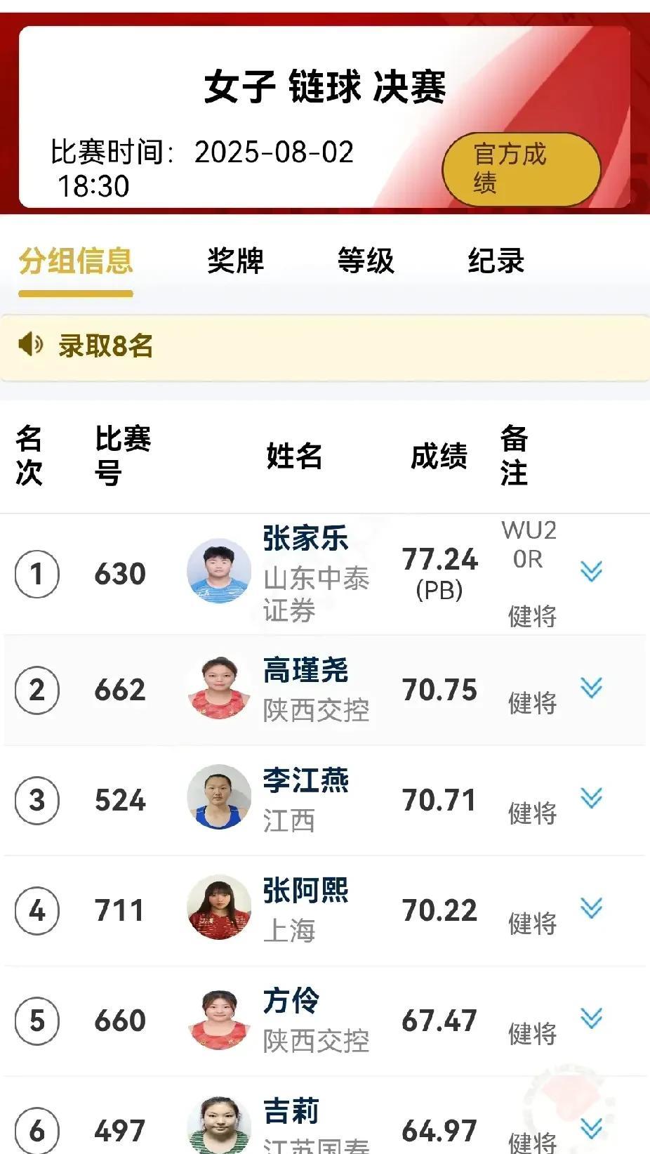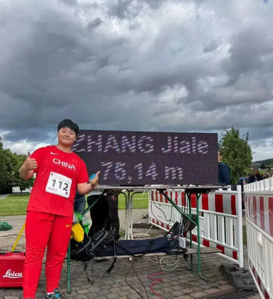 68.95米.2024年9月世青赛 75.14米.2025年6月21届国 际链球赛。破U20世界记录获亚軍 76.60米赵杰获冠軍 77.24米.2025年8月2日國内田径赛。再次大幅提高记录並获冠军 张家乐.女19岁.目标奥运會前8。