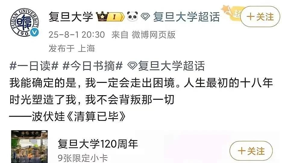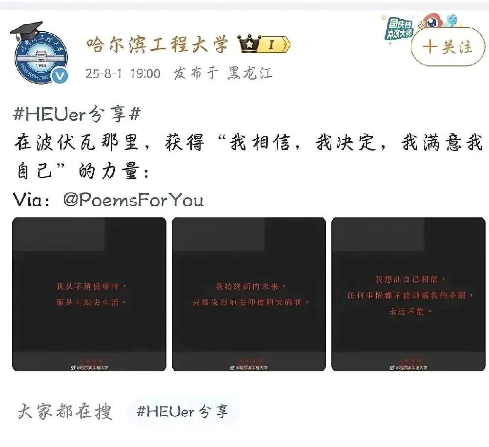 舆论阵地的战争从来都是无声,但硝烟弥漫的激烈状况却堪比真实战场。 浙江海洋大学、复旦大学、哈尔滨工程大学…… 这些大学不约而同地发布为法奸伏波娃唱赞歌的内容,要说没鬼,估计鬼都不信。 你要说它们是在声援武汉大学的杨景媛,似乎还低估了他们的用意。 这一天,是八一建军节啊! 这些大学对我国的法定假日无动于衷,却去歌颂毫不关联的人和事。 他们早就忘了新中国是怎样筚路蓝缕走过来的,也忘了正是先烈们抛头颅洒热血才能让他们在象牙塔内留下琅琅书声。 不应该, 不应该啊!