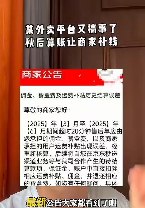 京东外卖登场仅仅几个月,就一地鸡毛,关键,还骂声一片。这个“骂声”来源,主要是商家。原来,京东居然直戳戳地找商家“秋后算账”,什么名目呢?答案是:结算误差,具体见图一。 这个公告我看了,说实话,下巴都差点掉下来,明眼人一看就知道:这纯粹是京东的服务器有问题。你服务器不行,不是应该自己检讨吗?你倒好,直接让中小商家买单? 公告实际可以算是京东搞的新招,它要求商家支付佣金、餐盒费以及运费补贴的历史结算误差。说白了,就是找商家搞钱。这种操作,当真是外卖史上绝无仅有。 我二姐在浙江的小店也和京东有合作,但好在他们整个岱山岛,京东现在的单量也就五六百单,他那小店,基本都是美团、饿了么订单,京东也就几单,所以这事对他影响不大。 但有的商家就麻烦了,京东搞这么一出,等于往他们本就不善的经营上“撒盐”他们是欲哭无泪。 从一开始招揽商家的时候喊的“0佣金”入驻,变成如今的高昂的活动费用、运费补贴,比支付佣金还贵;比如说好要给商家资源,结果活动补贴商家要承担70%;比如说好只做品质堂食,结果自己下场做纯外卖店铺,纯自营的模式让不少夫妻店无路可走。 这时候的很多人才如梦方醒:京东这些所谓的神仙操作,原来是要把商家逼上绝路啊!一开始,他们用996、超时罚款逼走全职骑手,如今又对商家下手了。 “一顿操作猛如虎”,这么操作法,究竟想干什么?当真让人看不懂,不禁让人怀疑:莫非是补贴太狠,平台没钱了?通过这种方式收回一部分成本? 说实话,竞争是好事,但如果竞争是良性的,比如去提升价值、做好自己,那当真是所有人之福;反过来,如果一味求快,无视人伦道德,那就只能是给所有人添堵添麻烦,当真不可取。 希望京东能回到良性竞争轨道上来,迷途知返,是为大善!