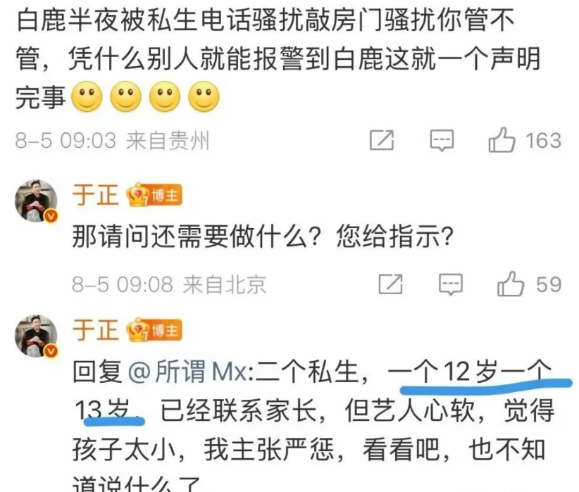 8月5日,于正说,白鹿最终选择原谅! 凌晨四点给白鹿打电话的人,查到了! 一个12岁,一个13岁,家境殷实,白鹿原谅她们,一方面是因为考虑到她们年纪太小了,有案底对她们未来的人生不好,另一方面是因为白鹿明白,最后的结果最多是警告罚款而已,这些并不能够给予她们一个教训! 不如选择原谅,好好跟她们说,这样的行为是不对的,给她们机会,让她们改正! 于正主张严惩,这次我站于正,有一就有二