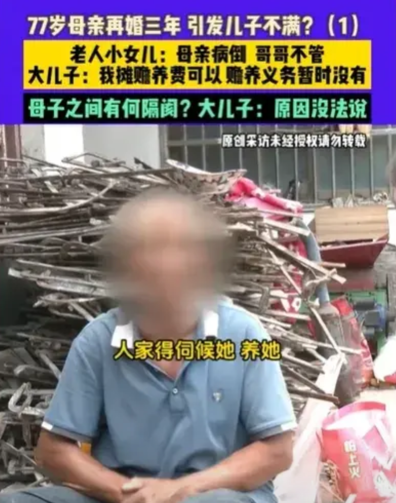 河南驻马店,74岁的大娘,看着老伴因病离世,她就改嫁了,3年后,却生病了,她要儿子养,儿子却说,嫁给人家了,就应该由人家来养,我这边不可能养他了,至于母子之间为何有这个隔阂,儿子说,这个原因没法说,反正他只愿意摊赡养费,不愿意养母亲。