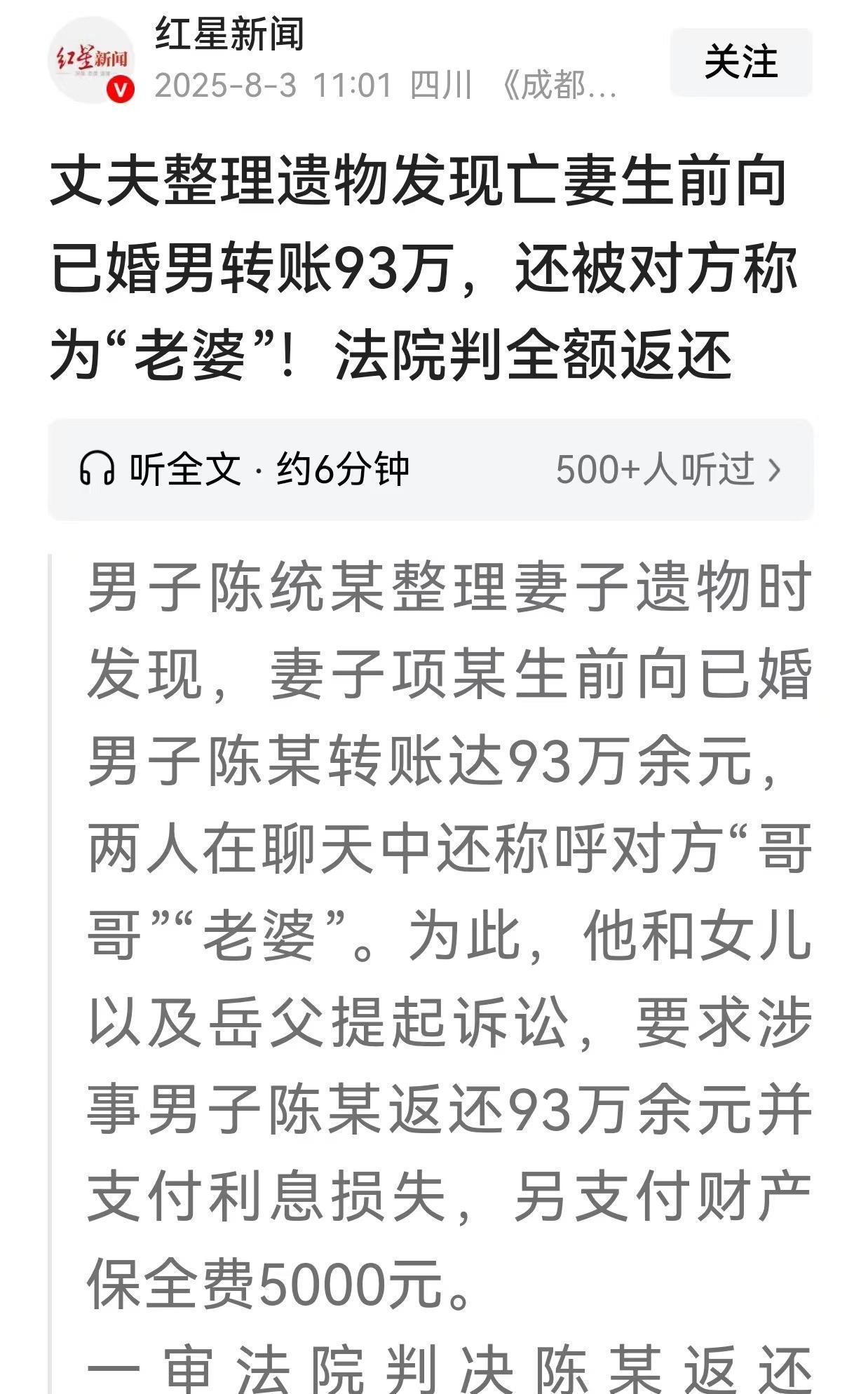 浙江宁波,一男子的妻子得肿瘤病逝,他痛失爱妻,哭的死去活来,可他整理妻子遗物时,顿时气的咬牙切齿,他发现妻子不但给他戴了多年的绿帽子,还给情人转了93万多,他用技术手段恢复了被妻子删除的聊天记录,她称呼情人“哥哥”,而对方叫她“老婆”,更刺激的话让男子气血上涌,他联合岳父和女儿,把第三者告上法庭,要求对方返还93万余元,支付5000元财产保全费,案子经过2审,法院这样判了。 8月3日,据红星新闻报道,陈先生和妻子项某属于未婚生女,女儿3岁时,他们在1996年,才正式领证结婚,喜结连理。 陈先生一直认为妻贤女孝,自己有个美满的家庭,他作为丈夫和父亲,也竭尽所能的给予老婆孩子幸福,每天起早贪黑的工作,对妻女无微不至。 可情深不寿,2023年9月25日,妻子项某却因恶性肿瘤,抢救无效离世,这给陈先生的打击是沉痛的,他不知道如何面对痛失我爱后的生活。 妻子去世后,为了不睹物思人,陈先生决定处理一下妻子的遗物,毕竟亡者已逝,不能在悲痛里无法自拔。 可这一整理,陈先生却发现了妻子的秘密,而这个发现,不但摧毁了陈先生对妻子的沉痛哀悼,还让他恨得咬牙切齿,怒发冲冠。 原来,陈先生发现,妻子早就背着他移情别恋,跟一个已婚的陈某搞在了一起。 妻子和陈某的聊天记录,很多都被妻子删除了,但这难不倒陈先生,他为了掌握证据,用技术手段进行了恢复。 陈先生发现,妻子叫陈某“哥哥”,而陈某叫妻子“老婆”,不但如此,妻子竟然给陈某在2016年5月到2023年8月的7年时间里,一共转账935250元。 这可把陈先生气的不轻,妻子背叛自己不说,竟然还倒贴,把家都掏空了,自己娶妻不贤,竟然还一直把她当成宝。 陈先生翻看着妻子跟陈某的聊天记录,言语亲昵,打情骂俏,妻子撒娇的问陈某:“嫌弃我了?”,而陈某却回说:“永远爱着老婆你”。 这些话,像一根针一样,刺痛了陈先生,也让他的愤怒无以复加,他决定,不能便宜了这个入侵者,联合岳父和女儿,一起把陈某告上法庭,要求他返还935250元,并支付5000元财产保全费。 可陈某却嘴巴一歪,狡辩说,93万不是项某赠予自己的,因为项某生前,跟他合伙做生意,那是资金往来。 可死无对证,陈某红口白牙没有说服力,他还找来证人给自己作证。 但法庭认为,既然是资金往来,就应该有往有来才对,可项某和陈某之间,大多数都是项某给陈某转账,其中不乏“520”这种让人一目了然的转账。 而陈某前后加起来,就给项某转过三次,一共才984元,根本不符合常理。 有人说,93万可能只是一部分 实际转账不止这么多 还应该从银行帐户入手继续追查。为打这场官司花多少钱的律师费,诉讼费、车旅费、生活费、误工费…都得算上。 还有人认为,整理遗物才发现,说明这93万很有可能不是共同财产,是项目的小金库。赠予又不是被诈骗,按照法律其实要不回来。 是什么家庭,被转出九十几万还没察觉到啊啊?这么有钱老婆却不忠?为何老婆临死都不告诉丈夫,她曾向别人转账九十多万呢?如果不是老公整理遗物发现,就白白损失这么多钱了!这些钱留给女儿不好吗? 那么,法院会如何判决呢? 《民法典》第1062条规定:夫妻在婚姻关系存续期间所得的财产,为夫妻的共同财产,归夫妻共同所有,夫妻对共同财产,有平等的处理权。 项某在婚姻存续期间向情人陈某转账的93万余元,属于夫妻共同财产。 根据《民法典》第1062条,夫妻对共同财产享有平等处理权,但项某单方将大额财产赠予婚外异性,且未告知配偶陈某,已构成对共同财产权的严重侵害。 项某与陈某的聊天记录,互称“哥哥”“老婆”、200余笔带有特殊含义如“520”的转账记录,结合陈某仅返还984元的事实,足以证明转账系情感赠与而非合法经济往来。 婚姻存续期间一方擅自处分大额共同财产的行为无效,配偶有权主张返还。 《民法典》第153条规定:违反法律、行政法规的强制性规定的民事法律行为无效。但是,该强制性规定不导致该民事法律行为无效的除外。 项某与陈某的婚外情及金钱赠与违反公序良俗原则,依据《民法典》第153条,此类民事法律行为自始无效。 法院查明项某与陈某均为已婚人士,双方亲密关系及转账性质明显违背婚姻忠诚义务和道德。 因此,陈某无合法依据取得该笔财产,必须全额返还。 陈某辩称“资金系生意往来”,但无法提供借条、合同等证据支持。法院结合转账备注“520”、单向高额转账等异常特征,认定其抗辩理由不成立。 最终,法院判决项某擅自处分夫妻共同财产且违背公序良俗,其赠与行为无效,陈某需全额返还93万余元及利息。 婚姻存续期间任何一方不得擅自处分大额共同财产,否则配偶可主张权利。 婚外情等违背道德的财产转移行为不受法律保护,需全额追回。 对此,你怎么看? 关注@运良说法 学法律知识不迷路 #头号创作者激励计划#