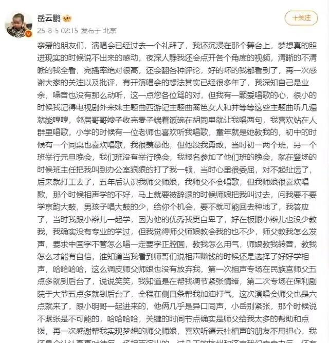 岳云鹏,勇气可嘉! 8月5日凌晨,岳云鹏在自己的社交平台上高调发长文,不是官宣新节目,而是回应演唱会的争议。 在长文中,岳云鹏说演唱会后,自己翻看了评论区,觉得网友对他骂得对! 他说自己有开演唱会的想法已经很多年了,也深知自己业余,嗓音也不动听。 文中,岳云鹏感谢了师傅郭德纲和师娘对他的培养,他们传授了不少唱歌的技巧给他。 岳云鹏表示之后仍会专注相声,会认真对待每场相声演出。 网友看完,评论说,岳云鹏明知自己业余,嗓音不动听,还敢开演唱会,这勇气可嘉。 再说他也没强迫人去买票,愿意听就去听,觉得他业余的,便不掏钱买票好了。 没什么好骂的。 谁规定相声演员不能开演唱会呢? 刘德华可以歌影视三栖,岳云鹏为何不能边说相声边开演唱会呢? 只要有人愿意听、愿意掏钱买票就行了。