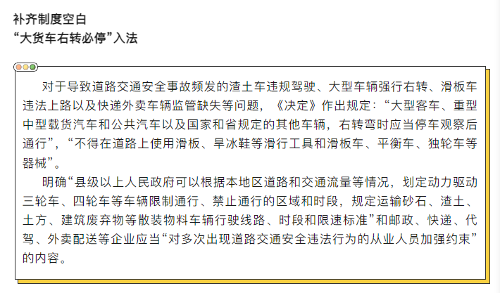 其中,最受关注的是“大货车右转必停”入法。何谓“右转必停”?是指经过路口右转的大货车提前减速停车让行,像大型客车、重型载货汽车、公共汽车等都在此列,这一办法的出台,是为了防止大车因为盲区导致事故发生。除此之外,像滑板、旱冰鞋等滑行工具和滑板车、平衡车、独轮车等,也被禁止上路。