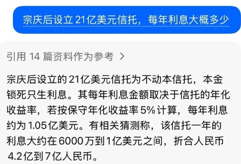 宗庆后设定的是不动本信托,本金锁死只生利息。宗庆后做了那么久生意,难道不清楚这样做,30年会让这笔信托无限贬值吗?即使年化5%的利率,相比于投资股票,私募股权,每年贬值5到10个点,30年后本金的购买力也就2亿多。