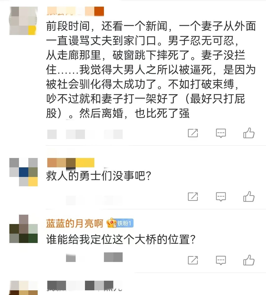 夫妻双方为什么就不能好好沟通呢? 起因:杭州一对30余岁夫妻因争执激烈,丈夫情绪失控翻越护栏跳河,桥面距离水面约15米;打捞数小时,男子已无生命体征。 而立之年,正是承上启下的年龄,基本上都是上有老下有小的阶段,同时也陆续面临各种各样的中年危机;为了生存下去,一分钟都不能停下来,结果导致各种压力长期积累、情绪无处释放、不重视心理健康问题、沟通不到位等等。 夫妻是最亲密的队友,是并肩作战的战友,一旦有问题,需要及时沟通,相互体谅,允许对方的“示弱”,拉住彼此的双手,一起共同解决问题。 你觉得夫妻需要怎么好好沟通,才能尽量避免同样的事发生呢?