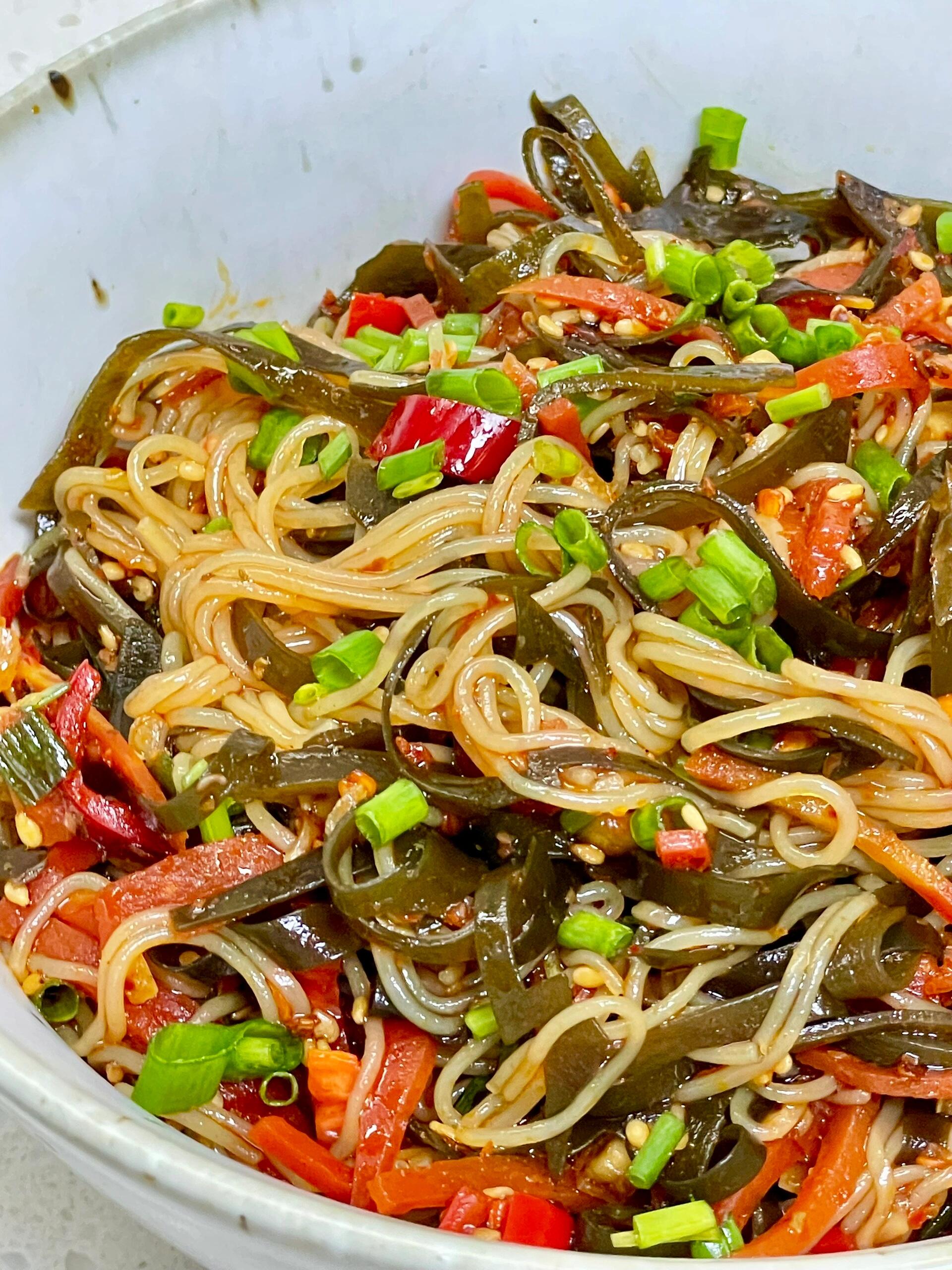 开胃爽口的凉拌三丝,附详细做法~ 夏天总会因为天气热导致没胃口,我不想吃饭的时候就喜欢弄些凉拌菜,今天这个凉拌三丝巨好吃,我又直接当主食吃了~ 1、葱花 蒜末 白芝麻 辣椒面 小米辣淋热油(怕辣的可以不加小米辣)加入三勺生抽,一勺陈醋,一勺白糖,少许盐 味精 花椒面 香油 一勺辣椒油搅拌均匀 2、粉丝煮软后捞出过凉水,海带丝和胡萝卜丝分别焯水后捞出,三丝放入碗中,淋上料汁抓拌均匀即可