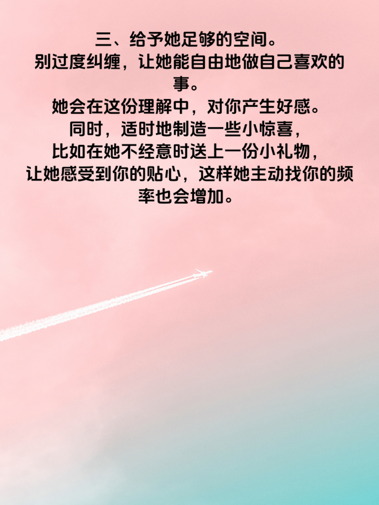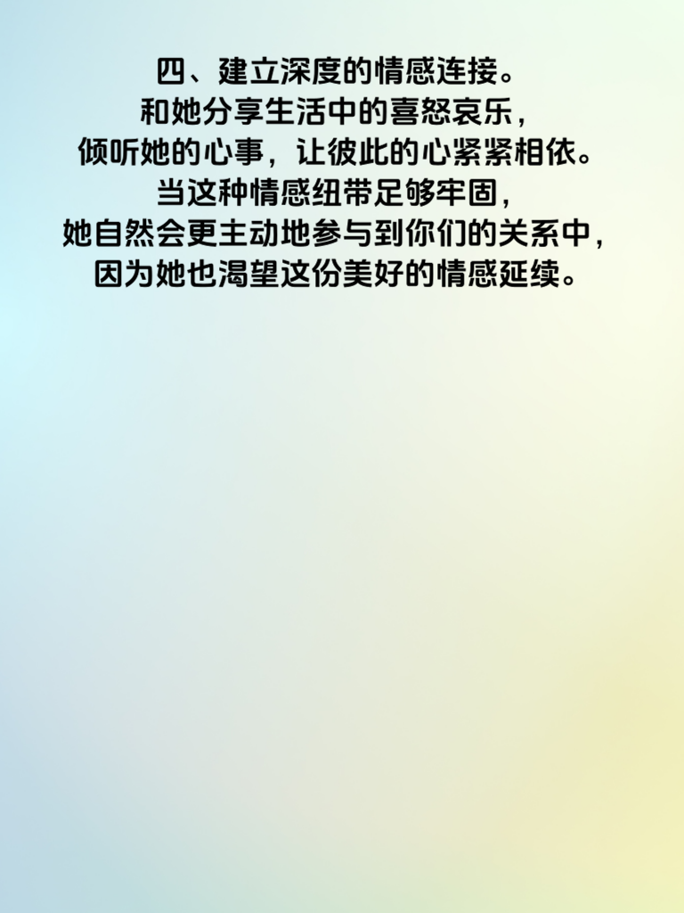 一、追求她,想让她主动?其实有秘密可循。首先,要真正了解她。每个人都有独特的喜好、梦想和价值观,当你用心去知晓她的一切,她会感受到被重视。比如知道她爱看书,就可以偶尔和她探讨书中情节,这能迅速拉近你们的距离。 二、展现你的魅力。魅力并非只是外表,更是内在的自信、幽默与才华。自信的你会吸引她的目光,幽默能让相处充满欢乐,才华则会令她心生钦佩。当她被你的魅力深深吸引,主动靠近你便不再遥远。 三、给予她足够的空间。别过度纠缠,让她能自由地做自己喜欢的事。她会在这份理解中,对你产生好感。同时,适时地制造一些小惊喜,比如在她不经意时送上一份小礼物,让她感受到你的贴心,这样她主动找你的频率也会增加。 四、建立深度的情感连接。和她分享生活中的喜怒哀乐,倾听她的心事,让彼此的心紧紧相依。当这种情感纽带足够牢固,她自然会更主动地参与到你们的关系中,因为她也渴望这份美好的情感延续。