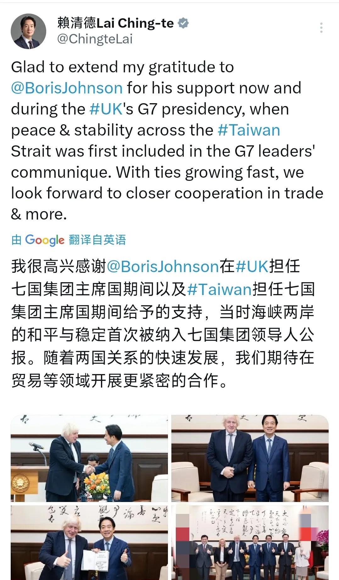 赖清德今晚(8月5日晚)写道:“很高兴向鲍里斯·约翰逊表达我们的感激之情。感谢他
