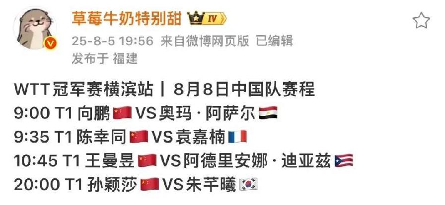 wtt横滨冠军赛8月7日和8日的国乒赛程, 非常友好, 不用熬夜也不用早起。 7号有大头的比赛, 莎莎的比赛在8号, 她应该是首轮, 中国队的最后一场, 这样挺好的, 莎莎还有两天的适应时间, 到时候状态也会更好点, 这比比赛感觉打不了几场就要结束呀, 赛程太短了!