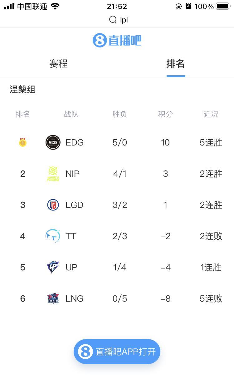组内赛五连全胜未负一小场 最终要靠EDG重铸LPL荣光 无人问津的涅槃组,EDG已经五连霸榜了,更恐怖的是一个小局都没输过!这样的队伍进涅槃组是不是有点欺负人了?感觉进登峰组混个前六问题不大吧? 身为国电粉却很久没有看过国电比赛的我不禁想起了四年前的那个秋天[笑哭][笑哭][笑哭]