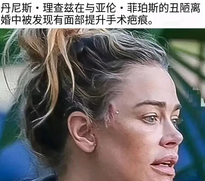 让一个美女接受自己正在变老是件多么不容易的事情啊!现在丹妮斯的嘴越来越像桑切斯了! 丹妮斯·李·理查兹,1971年出生,美国厄尔卡米诺高中学历。她父亲是个工程师,母亲开着咖啡连锁店,丹妮斯是两闺女中的老大。 首任丈夫理查·辛的父亲马丁·辛是好莱坞著名演员、导演和制片人。理查·辛也出演过《三个火枪手》、《好汉两个半》等热门电影,一个劣迹斑斑的好演员。 丹妮斯与他2002年结婚,2006年离婚。 二婚洛拉·罗斯·辛,两人正打离婚官司,丹妮斯控诉老公家暴。 近期她在洛杉矶街头被拍,两边太阳穴各有一个切口,发际线周围肿胀,眼部有淤青,疑似刚做完内窥镜提眉或拉皮手术。 丹妮斯身高165,20出头就在演艺圈混出了名气,2002年被评为“世界是最性感的女人”第21名。 这么多年,丹妮斯一直活跃在好莱坞影坛,参加真人秀节目《比弗利娇妻》更是让她中年又火了一把。 漂亮国的整容医师技术看起来都差不多,很多女名人整完了都和桑切斯很像,尤其是嘴部。