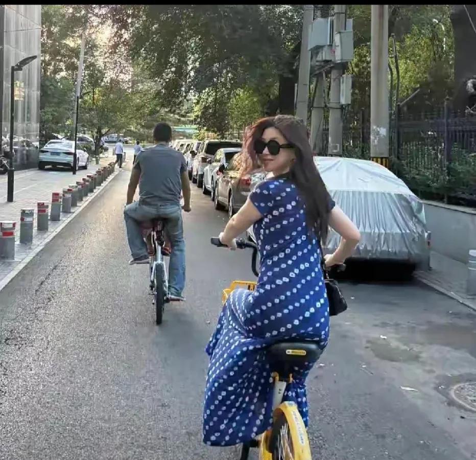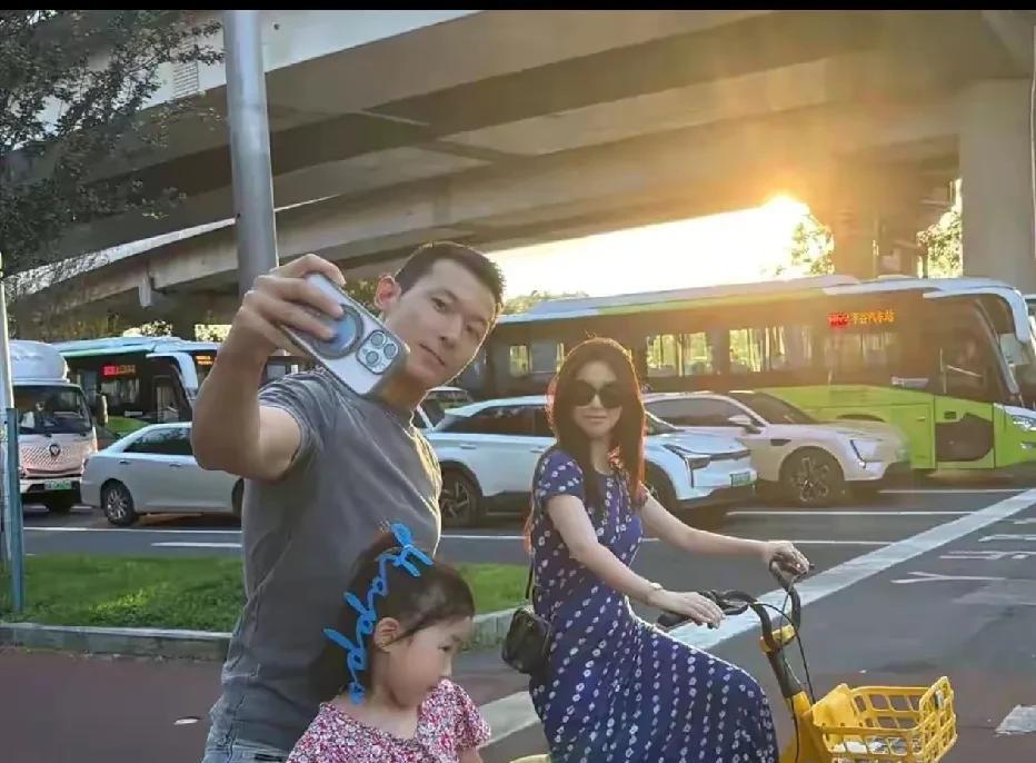 演员朱珠一家三口街头骑单车,画面看着真温馨啊