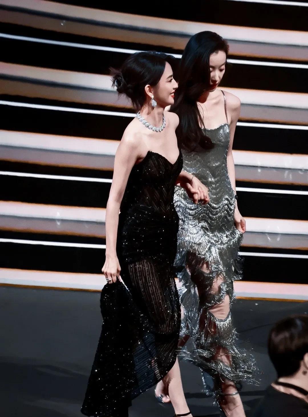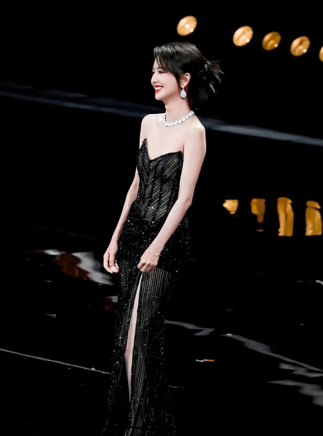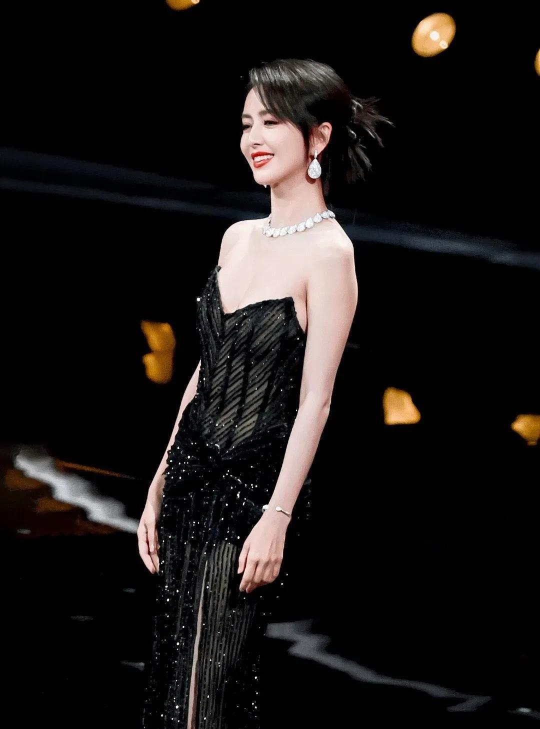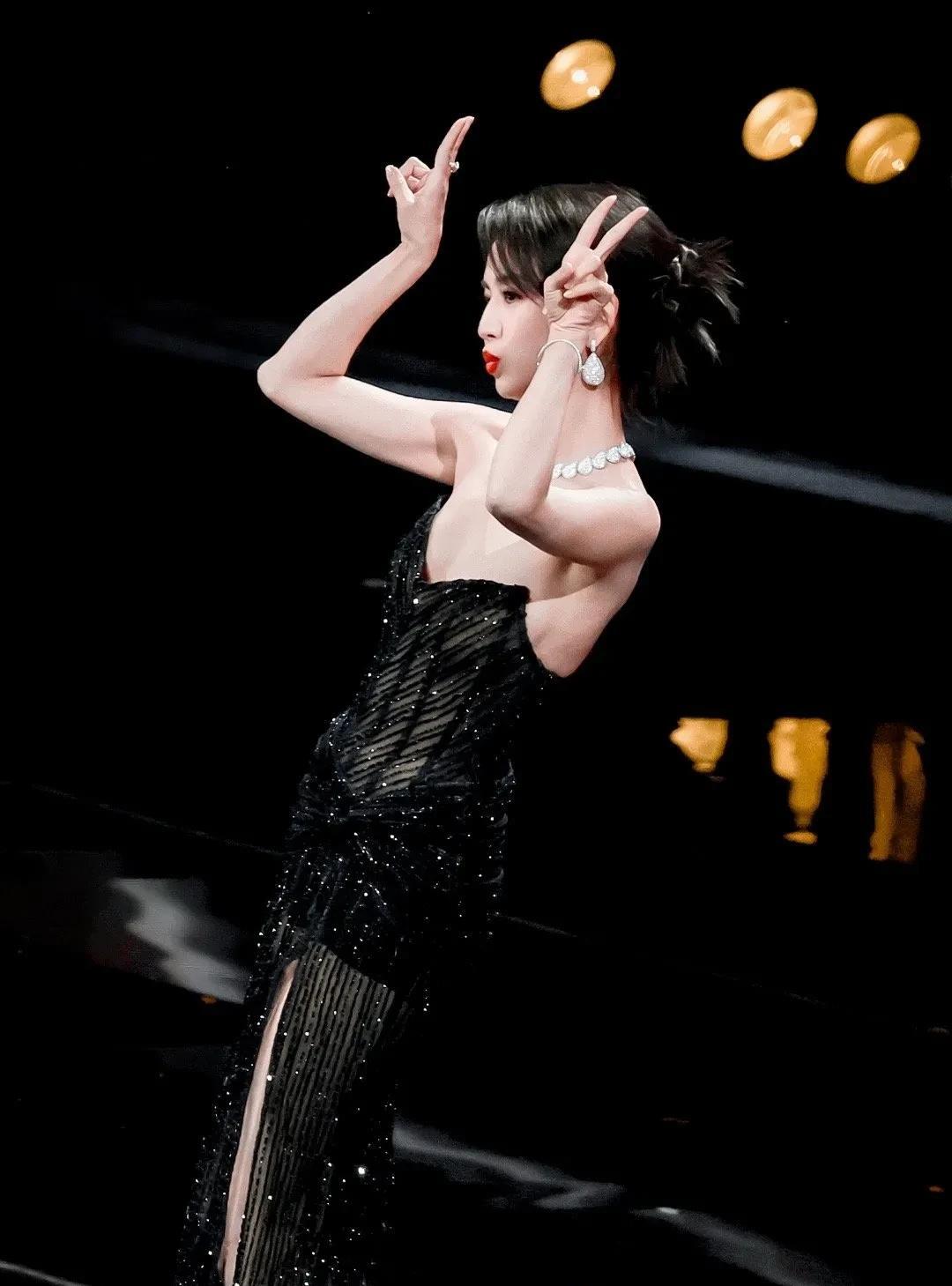 佟丽娅穿闪耀黑裙,开衩秀美腿,台上比耶甜笑,曲线勾人,这性感直接把舞台炸出火星子!
