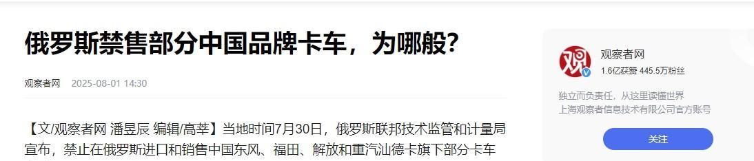 动了俄罗斯的蛋糕?俄方开始对中国下手,关系再好咱们也得多留个心眼。 7月30日,俄罗斯联邦技术监管和计量局宣布,禁止在俄罗斯进口和销售中国东风、福田、解放和重汽汕德卡旗下部分卡车车型。 可能有人要问了,俄罗斯为啥突然来这么一手呢?其实啊,这里面的门道可不少。 自俄乌冲突爆发后,欧美韩等跨国车企迫于制裁压力,纷纷撤离俄罗斯市场。这对咱们中国车企来说,那可是个千载难逢的好机会。 咱们的汽车大量涌入俄罗斯,2023 年出口量大幅增长,到了 2024 年,出口量更是达到了 115.8 万辆,占中国汽车出口总量的约两成。 在俄罗斯市场,中国汽车的份额越来越大,尤其是在卡车和轻型商用车领域,中国品牌那可是占据了半壁江山。这可让俄罗斯本土汽车品牌压力山大啊。 俄罗斯一直有扶持本土汽车品牌的想法。 他们通过提高进口汽车的认证门槛,上调回收税等手段,想给本土车企创造更多的发展空间。 毕竟,俄罗斯的汽车工业和军事工业比起来,确实不够发达,汽车产业链也不够完善。 之前俄罗斯销量最高的本土品牌拉达汽车,还严重依赖法国雷诺汽车呢。 而现在,随着中国汽车在俄罗斯市场的影响力越来越大,俄罗斯担心自己的汽车产业会过度依附于中国。 还有一种可能,俄罗斯或许希望借此机会,推动中国车企在俄罗斯加大本地化生产投入。 你想啊,如果中国车企在俄罗斯设厂生产,既能促进当地就业,又能实现技术转移,提升俄罗斯自身汽车产业的整体实力。 不过呢,对于俄罗斯指出的这些问题,咱们部分中国业内人士也有不同看法。 有人觉得,可能是俄方采用了和国内不一样的测试标准,或者中国车企对俄罗斯法规理解存在偏差。 毕竟,中国商用车在全球上百个市场都有不错的口碑,像重汽、陕汽、福田等品牌的轻卡、中卡和重卡在很多地方都备受认可。 而且,俄罗斯本土卡车制造商卡玛兹打造的新车型驾驶室标准,和中国重汽的汕德卡 ZZHS 基本相同,可卡玛兹的市场份额却低于中国重汽。 所以,这次俄罗斯对中国卡车的举措,难免让人觉得有那么点 “找茬” 的意味。 面对俄罗斯的这些动作,中国车企可得冷静应对。 同时,不能把鸡蛋都放在一个篮子里,得加快多元化市场布局,开拓欧洲、东南亚、中东、非洲等其他海外市场,分散风险。 从政府层面来讲,也得给出口企业提供更多支持,搭建沟通平台,让企业及时了解俄罗斯政策法规的变化。 通过外交渠道,和俄罗斯方面好好协商,维护中国车企在俄罗斯的合法权益。 这次俄罗斯对中国卡车品牌的指责事件,虽然带来了挑战,但也未尝不是中国汽车产业进一步提升和完善的契机。 只是这国际关系复杂多变,就算和俄罗斯关系再好,咱们也得多留个心眼。 大家觉得,中国车企接下来该怎么做,才能更好地应对这种局面呢?