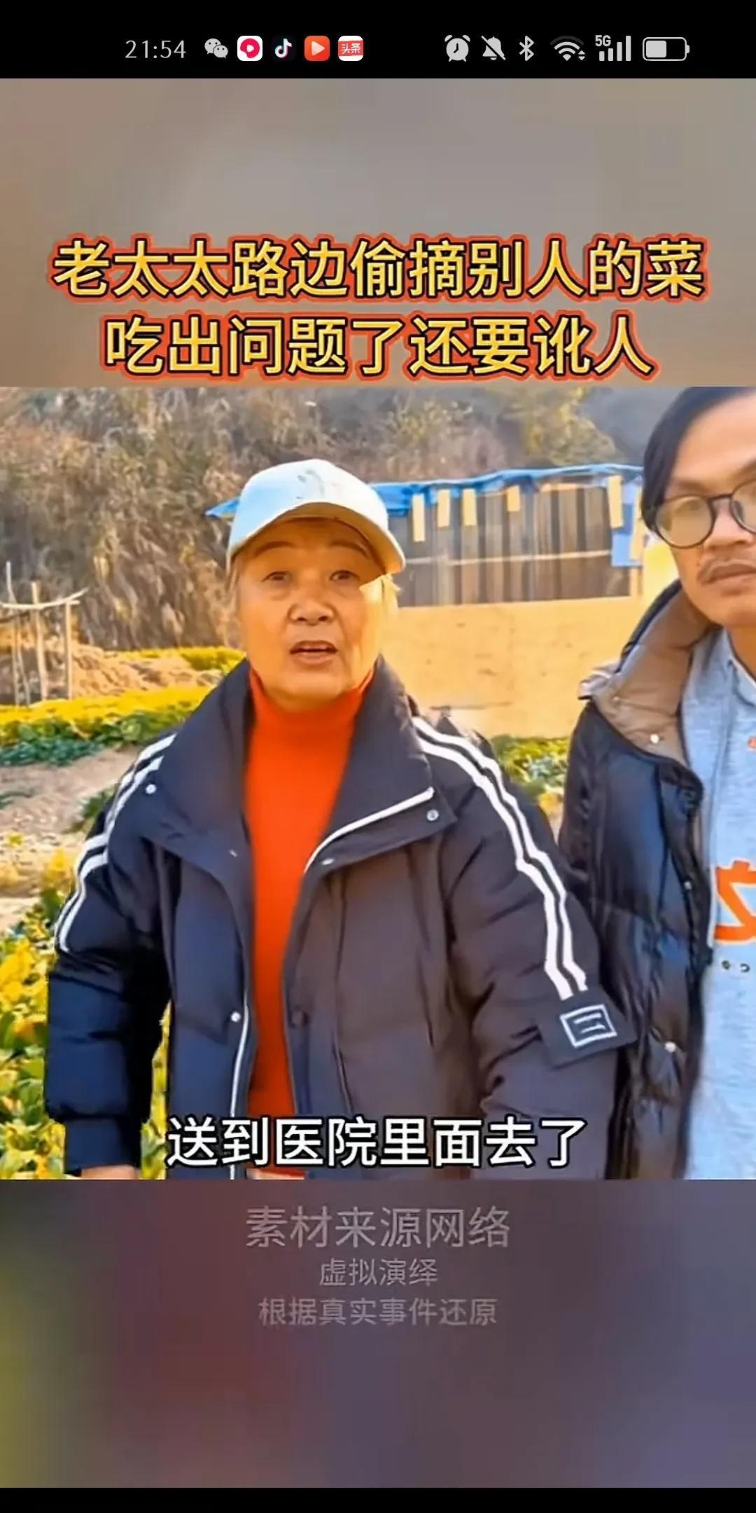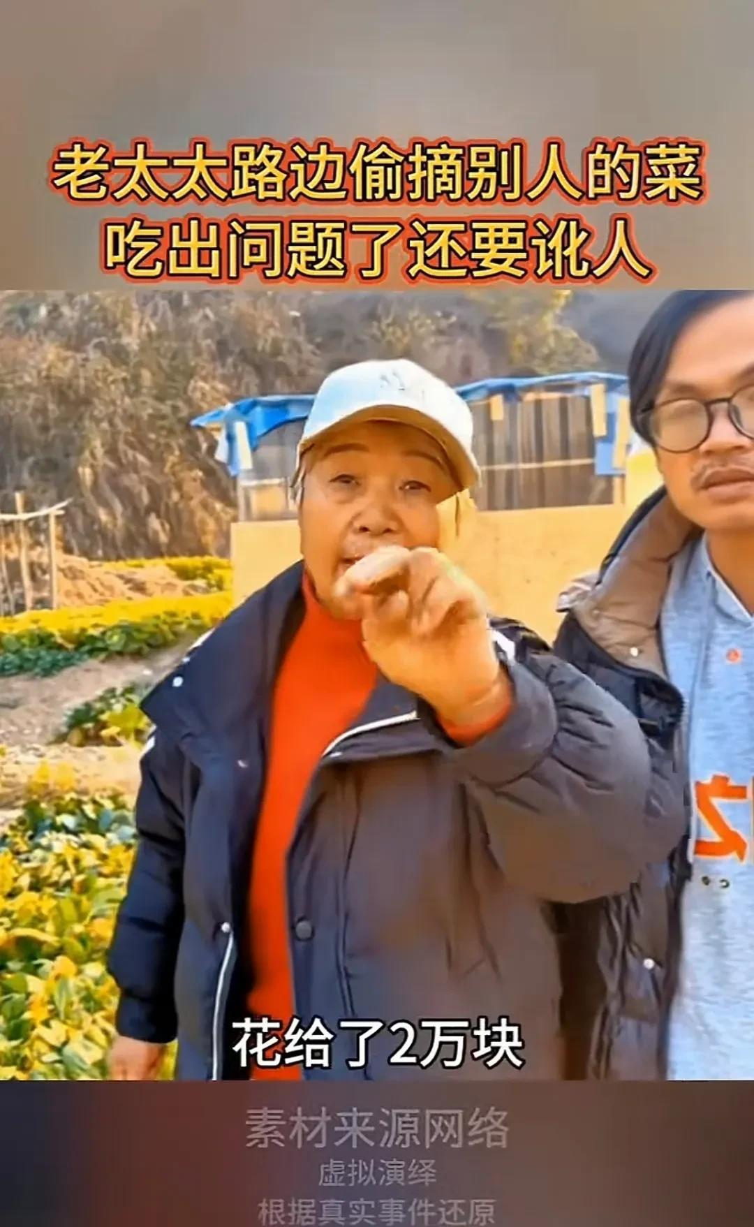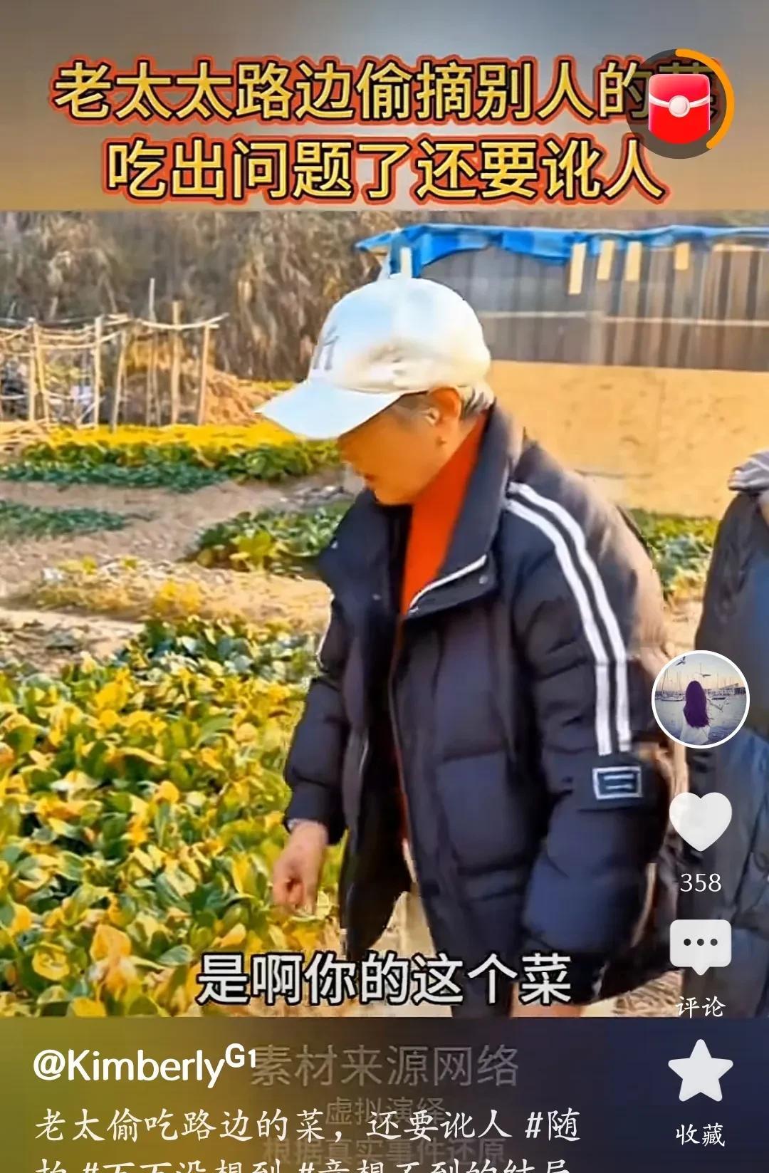老太夫妻俩偷了人家菜,肚子疼送医院花钱了,找到菜地主人要赔钱,理由有三: 一、你为什么不挂警示牌! 二、人家的菜我吃了都没事,就你的有事,不找你找谁? 三、不赔钱休想走! 看来社会公理你道德,在每个人心里标准不同呀!但不知,这是教育之故,还是骨子里生来就有的?