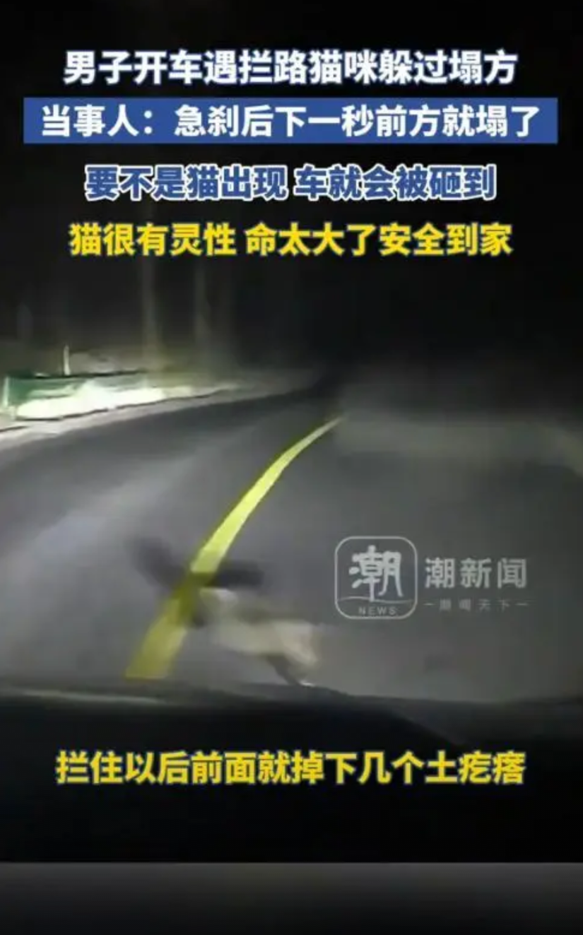 到了晚上十点多,武先生小心翼翼地开着车,刚拐过一个小弯,突然看到路中间蹲着一只小猫。他吓得赶紧踩刹车,车在离小猫不远的地方停了下来。小猫被吓得跳了起来,愣了两秒钟后突然跑到路对面去了。武先生正准备继续开车,突然看到前面几米远的地方尘土飞扬,什么都看不清了——原来是前方山体塌方了。武先生心想,要不是那只小猫突然跑出来挡路,他的车可能就正好开到塌方的地方了。那一刻,他吓得浑身冒冷汗,心里只剩下庆幸。他明白过来,是那只小猫“救”了他一命。