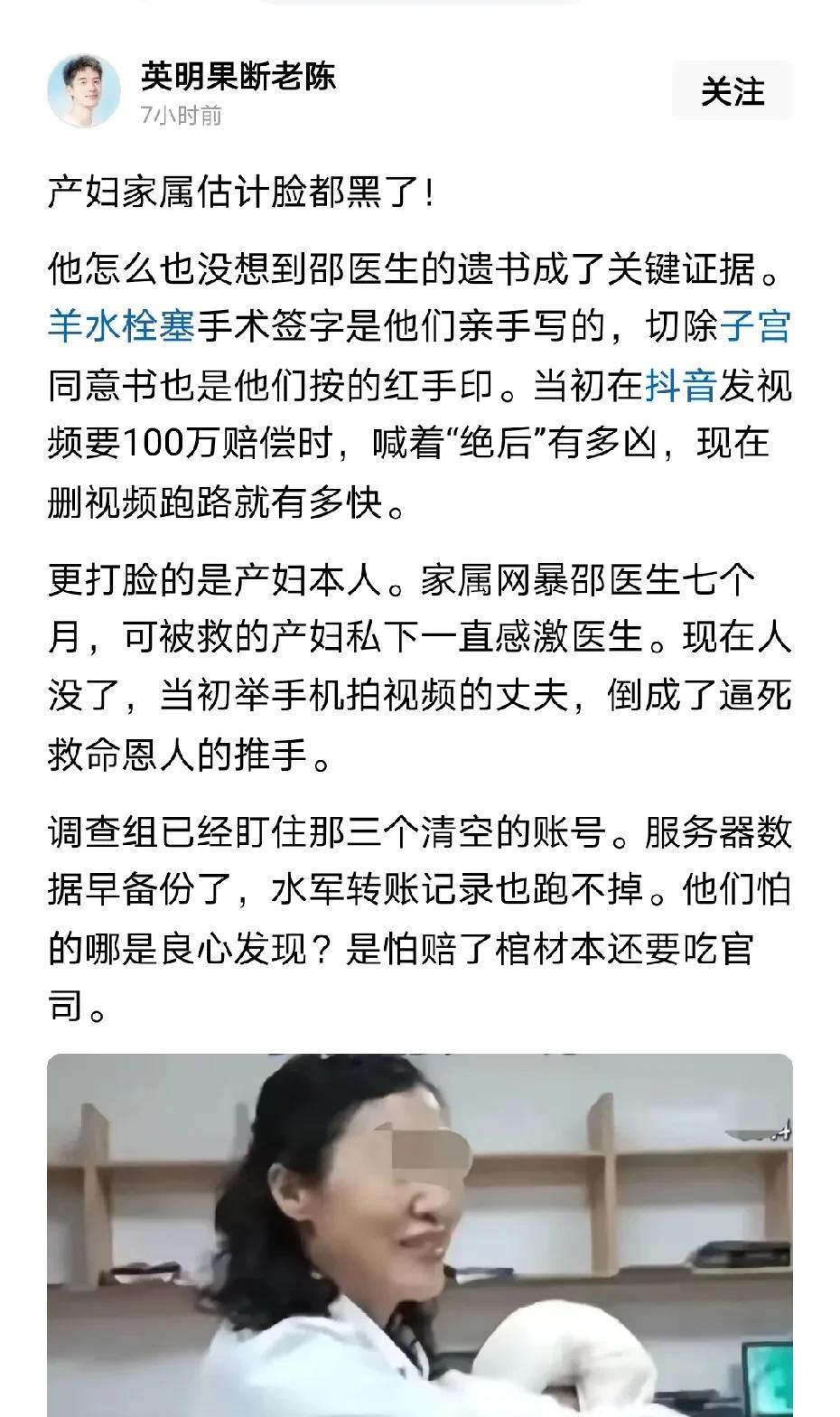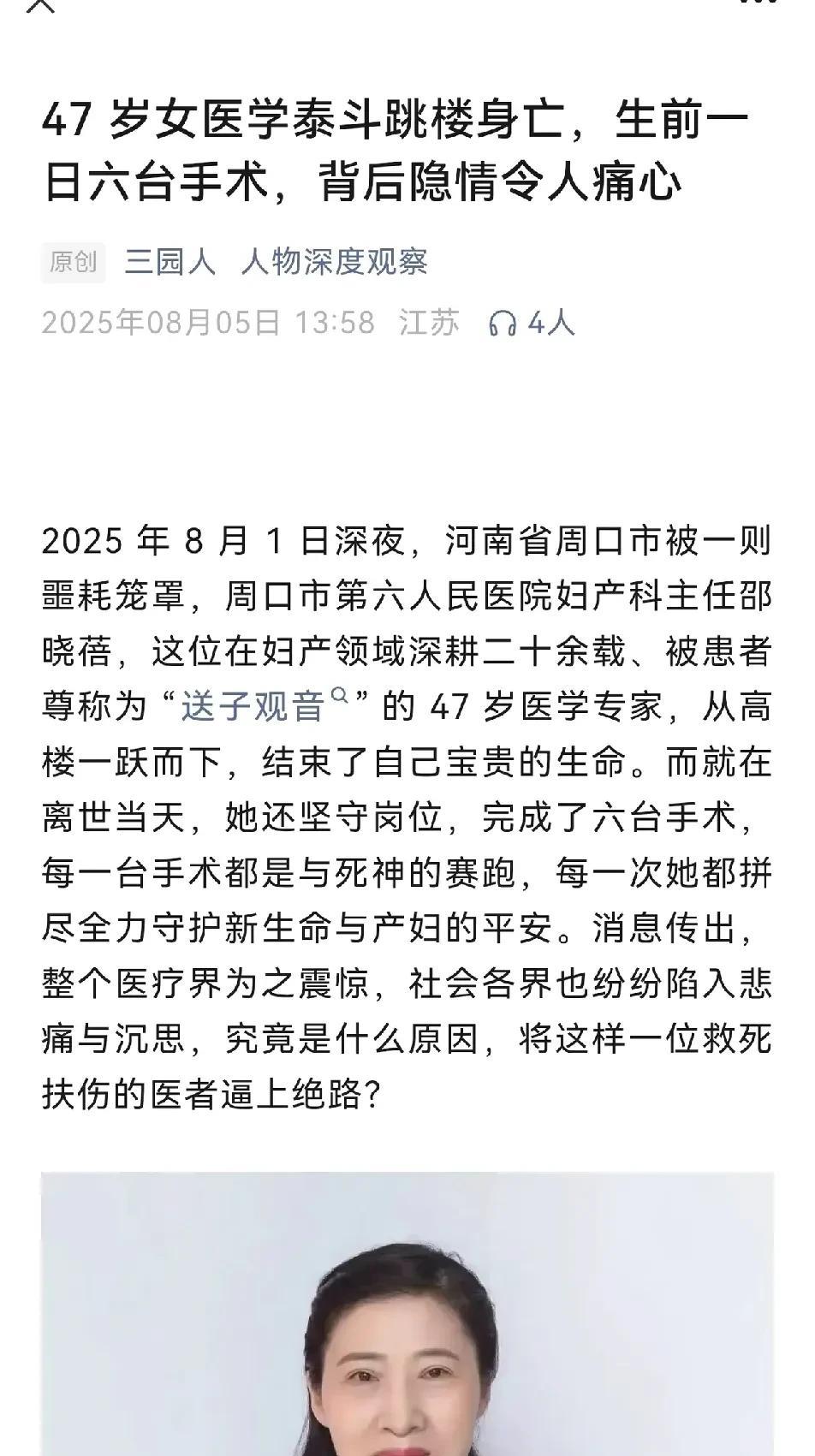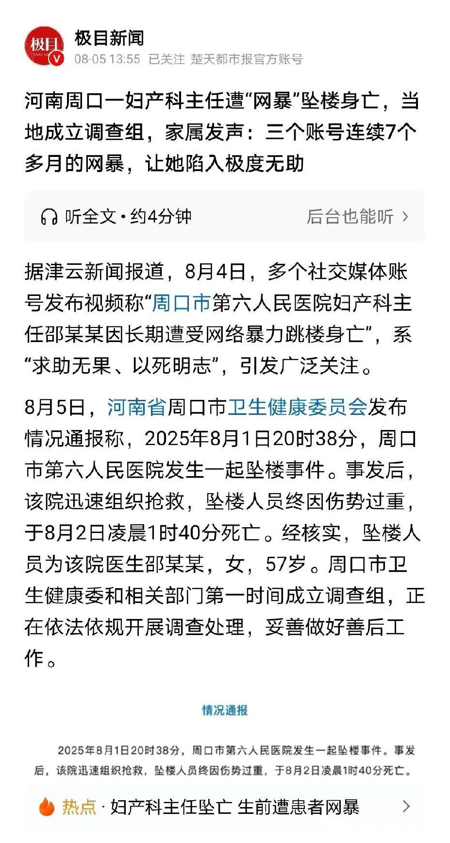 周口妇产科主任坠楼身亡这件事,事实上,妇产科主任所在的医院是负有一定责任的。由妇产科主任因不堪受辱而坠楼这一情形可知,她必然是一个极为珍视自己声誉的人。 倘若周口医院能够在妇产科主任遭受侮辱的时候,及时站出来为她发声、给予支持,或许她就不会走上绝路。 周口妇产科主任坠楼事件,也暴露出我们的法律在应对“软性医闹(网络攻击诽谤)”方面存在的空白。#周口妇产科主任因网暴跳楼#