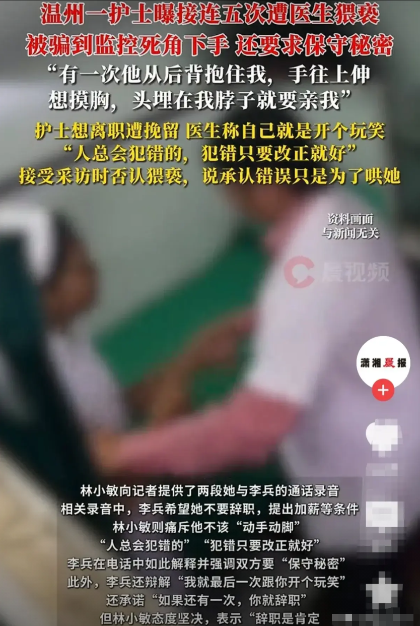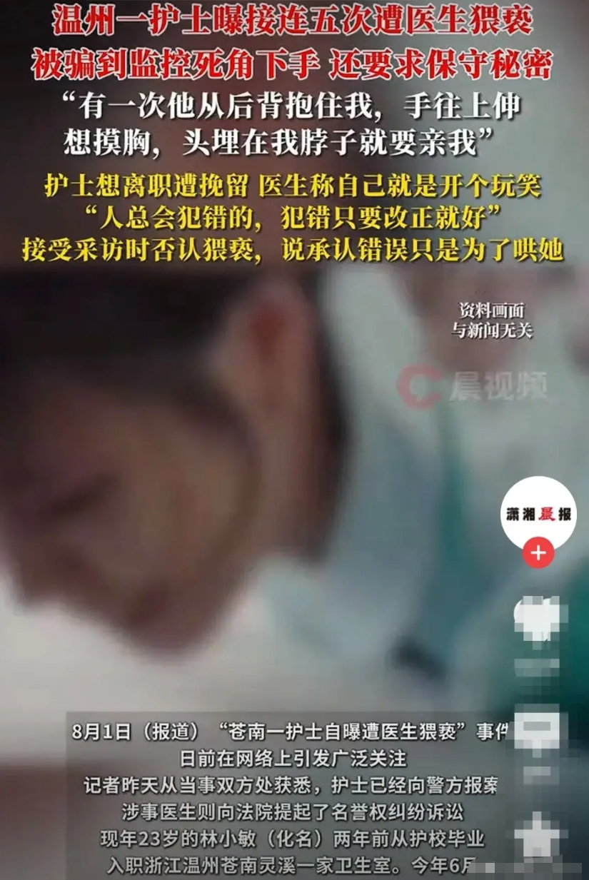 浙江温州,23岁女孩卫校毕业,入职一家卫生室当护士。男医生见她年轻秀美,利用工作之便,多次对她动手动脚,女孩怕丢了工作,也怕被别人说闲话,只能把委屈往肚里咽,可男医生变本加厉,一年时间被骚 扰五次,而且越来越过分,女护士每天胆战心惊,实在绷不住,她辞职后报警。不料,男医生反手给女护士告了,称损害了他的名誉权。女护士仅用一招,男医生被狠狠打脸! 23岁的林小敏是农村姑娘,两年前从卫校毕业,揣着爹娘的期望,在温州苍南一家卫生室找了份护士工作。