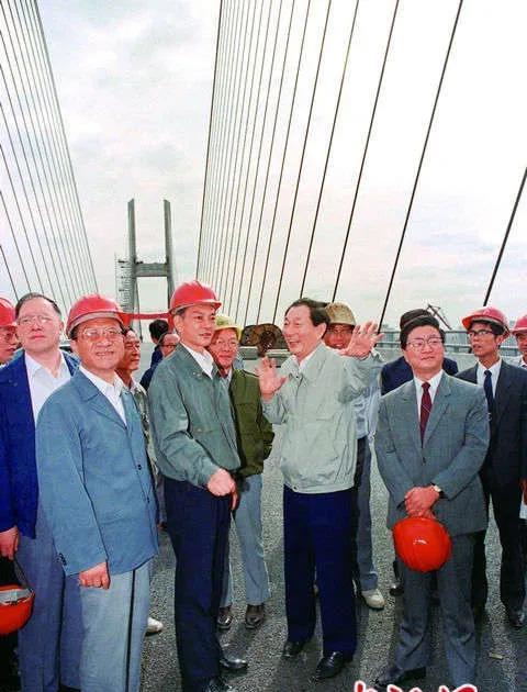 1991年10月中旬,为搞好国营大中型企业问题,在上海进行考察,视察即将建成通车的南浦大桥。右二为中共上海市委副书记、市长黄菊,右六为副市长倪天增,左一为市政府秘书长、办公厅主任万学远,左二为市建设委员会主任吴祥明。