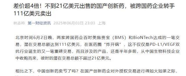 这下亏大了?6月2日,中国自主研发的“抗癌神药”,被外资企业以72亿的价格买走,紧接着,为了实现利益最大化,该外资又转手将其卖了800亿。网友直呼“亏大了”! 一款原本由中国自主研发的抗癌“神药”,被德国一家公司以天价转卖给了美国药企。这笔高达780亿元人民币的交易,这剂救命良药,几年前还握在国内一家名不见经传的生物药企手中,而当时的卖价,仅仅是“天价”的零头! 这剂“神药”,名为BNT327,普米斯公司内部代号PM8002。它是一种独创的PD-1和VEGF双特异性抗体,简称为“双抗药”。PD-1能帮助肿瘤细胞逃避免疫系统的追杀,而VEGF则能为肿瘤提供充足的养分和生存环境。 PM8002的厉害之处在于,它能双管齐下,同时抑制这两个关键靶点。更令人振奋的是,体外实验数据显示,这种双特异性抗体在特定条件下,能将与PD-1、VEGF的结合能力提升十几倍,展现出非凡的协同效应。这简直是癌症治疗领域的一大飞跃! 未来的癌症患者,或许就能告别那令人痛不欲生的化疗,转而用上这种精准高效的双抗药。可以说,谁掌握了这种双抗药,谁便掌握了治疗癌症的“话语权”,甚至于“控制生死的权力”。 普米斯凭借这款PM8002,在竞争激烈的双抗药领域一路披荆斩棘。即使默克和葛兰素史克的同类药物临床试验相继受挫,PM8002凭借优异的数据,一度跻身全球前三甲,堪称中国创新药的骄傲。 就在PM8002大放异彩之时,德国BioNTech生物公司慧眼识珠,以超过10亿美元的价格,买下了PM8002在海外的所有权益。 当时,普米斯仅获得了5500万美元的首付款,剩余款项则要看药物的后续开发进展。短短几个月后,普米斯更是做出了一个惊人的决定,将整个公司以区区8亿美元的价格出售给了德国BioNTech。 至此,这款承载着国人希望的抗肿瘤创新药,连带着它的研发团队,彻底失去了主导权,普米斯的原团队也只能沦为执行方。今年6月2日,更令人震惊的消息传来:美国跨国药企BMS竟然出资111亿美元的“天价”,与德国BioNTech达成合作,共同开发并商业化BNT327(即PM8002)。 要理解普米斯的选择,或许得深入体谅创新药研发领域那如同“无底洞”般的资金需求。从实验室的瓶瓶罐罐,到数十年漫长的临床试验,一款创新药从诞生到最终上市,平均需要耗费10到15年的时间,投入资金更是常常超过10亿美元。 普米斯自然也深陷其中。虽然从2020年起,普米斯通过四轮融资,累计获得了超过2.4亿美元的资金,这其中不乏联新资本、IDG资本等知名投资方的支持。 可2021年到2023年间,国内几乎没有了普米斯的融资消息,等到它再次出现在公众视野时,融资对象已悄然变成了国外的BioNTech。普米斯的困境并非个例,这正是国内整个创新药领域“资本寒冬”的一个缩影。 据统计,2023年,生物技术/医疗健康领域的IPO融资额还有268.94亿元,到了2024年,这个数字骤降了近60%,仅剩55.45亿元。 面对如此严峻的融资环境,许多创新药企别无选择,只能通过BD(商务拓展)交易,将自己的研发成果出售给跨国药企,以求渡过难关,活下去。甚至有创始人直言:“当下最首要的任务就是活下去。” 诺和诺德的明星减肥药司美格鲁肽,2026年专利即将到期,这意味着这家凭借其年入280亿美元的巨头,将面临营收断崖式下跌的威胁。为了填补未来新药的空缺,跨国药企除了内部研发,更倾向于通过投资、并购来获取处于研发中后期、风险更低的新药。 中国创新药的独特优势,正完美契合了它们的需求。中国创新药的技术新颖,国内药企在医药研发上的投入和突破令人瞩目,许多创新药都采用了新靶点、新作用机制,例如恒瑞医药在抗肿瘤等领域便有所成就。 中国创新药的数据卓越,临床试验结果往往表现出色,比如康方生物的PD-1/VEGF双抗AK112,在与默沙东的“K药”的头对头试验中表现优异,引得SummitTherapeutics直接以5亿美元首付款获得了海外权益。 中国创新药的研发成本相对较低,这使得我们的药物在定价上更具竞争力,既能保障患者可及性,也为跨国药企提供了更大的利润空间。 跨国资本的注入,不仅能帮助我们度过眼前的融资困境,还能带来再造血能力,为未来的研发突破提供资金和资源,甚至带领我们走向更广阔的国际市场。 攻克癌症肿瘤本就极度艰难,若是这种“控制生死的权力”被国外抢占,高价药的窒息感只会让国内患病的普通人再次陷入绝望。