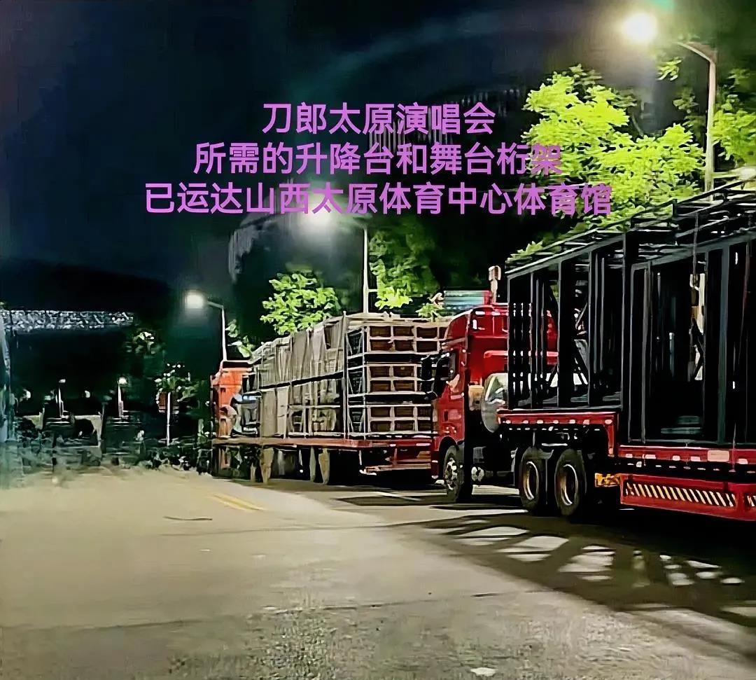 刀郎太原演唱会前期所需的升降台和舞台桁架已经到达目的地,这些运送桁架的货车途经湖