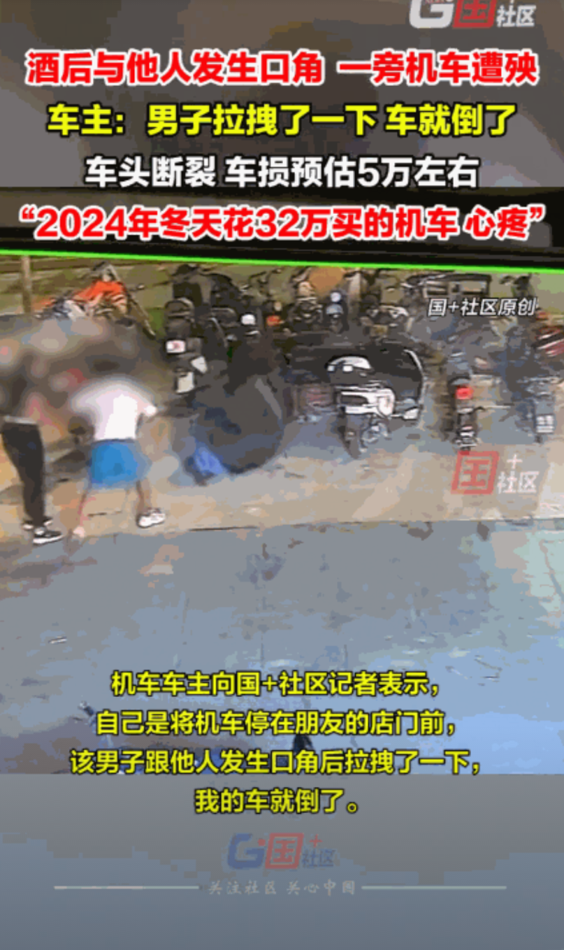 当时,一名醉酒男子在店门前和他人发生了口角,二人在推搡过程中,醉酒男拽了一下摩托车,结果摩托车就倒了下去,重重摔在地上。