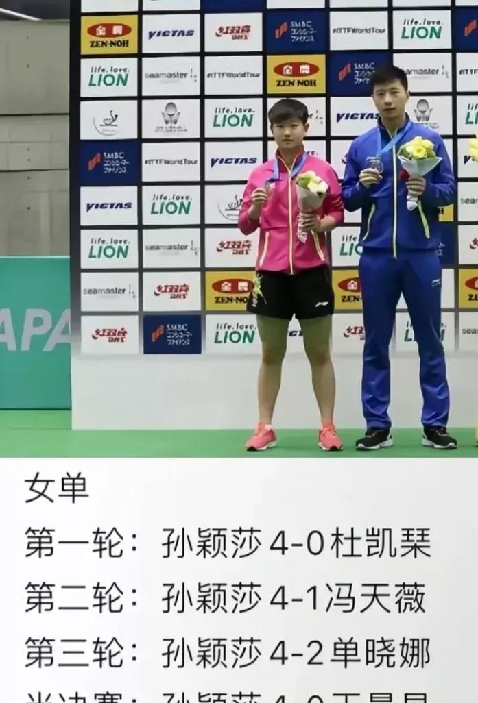 2017年6月孙颖莎刚升任一队, 教练让陈梦带她去长长见识,结果 她让教练长见识了。 莎莎当时刚升任一队, 是陈梦的陪练, 第一次去打国际比赛, 结果完全没有年轻人的觉悟, 上来就把世界冠军冯天薇干挺了。 半决赛4:0又打赢了王曼昱。 决赛1:3落后的情况下, 连下三局逆转了陈梦夺冠。
