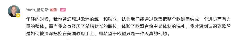 希腊前财长:有中国谣言说欧盟是美国的狗,我澄清一下,不是谣言 “有谣言说欧盟是美国的走狗?我澄清一下,这不是谣言。”希腊前财长瓦鲁法基斯的这段视频,最近突然火了。 按照这位欧洲马克思主义学者的说法,欧盟从娘胎里就是美国设计的工具,根本不是什么政治实体。 二战后欧盟按华盛顿图纸搭建,本质是美元回收系统:美元流欧重建,欧洲买美国货,钱再回流美国。布鲁塞尔就是管理这个垄断联盟的行政中心,跟中国这样的主权国家完全不同。瓦鲁法基斯当过希腊财长后才醒悟,欧盟官僚体系根本不代表欧洲人利益。 现在冯德莱恩签的美欧协议更印证了这点:欧盟扩大买美国军火,军费要提到GDP5%,经济安全双重锁死。北约和欧盟总部都在布鲁塞尔,不是巧合,美国通过这套体系把欧洲攥得死死的。 欧洲不是没明白人,可惜瓦鲁法基斯这样的清醒派早被边缘化。想重构政治实体?法德没动力,极右翼又捣乱。转向东方拥抱多极化?怕是拉不下脸。 当年中国签南京条约是百年耻辱开端,如今欧盟一步步退让,叶赫那拉氏的诅咒要应验了?留给欧洲人的时间,真不多了。