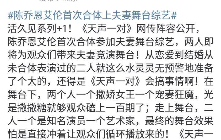 这一次,陈乔恩艾伦合体,来到了一个全新的综艺舞台! 陈乔恩,艾伦,夫妻合体,人到中年,带来生活新气象,迎来追梦新高度! 这不,《天声一对》网传阵容公开,陈乔恩艾伦首次合体参加夫妻舞台综艺。 机会是留给有准备的人! 从陈乔恩到艾伦,从夫妻到搭档,好好相处,团结合作,可谓是棒极了! 事实上,当陈乔恩和艾伦结婚以后,他们就生活幸福。现如今他们又携手新舞台,这真是一个美好的结果! 祝福你们! #夏日生活打卡季# #陈乔恩#