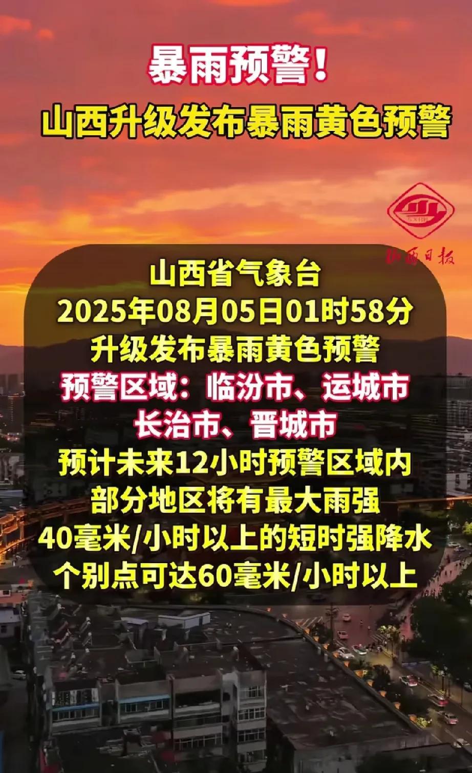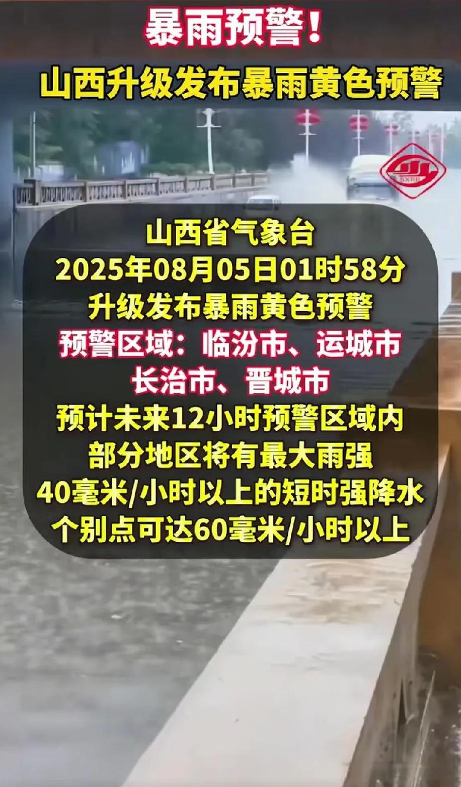 临汾、运城这回不用羡慕大同下雨了,你们那儿的大暴雨也来了。 这老天爷对谁也是公平的。前几天你们那里热的一点儿雨也不下,羡慕大同羡慕的不得了,评论区里是一片唉叹声。现在大暴雨真的来了。山西省气象台8月5号1时58分,发布暴雨黄色预警,预计未来12小时内将有大暴雨,个别地区每小时将在40~60mm降雨量呀。这一下你们不用羡慕大同了,这雨下的可要凉快了。