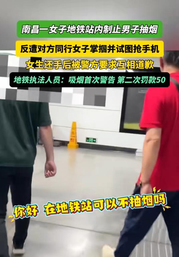 “冤不冤!”8月3日,江西南昌,一女子在乘坐地铁时,因为看到前方的男子在抽烟,于是冲上去阻止,可因为她直接拿手机拍摄,引起了男子妻子的不满,双方发生了冲突,最终民警赶到之后,双方却互相道歉?网友:这次真不是谁发视频谁有理! 现在很多人只要出了门,总是一种把手机对着别人拍摄的动作,这对于很多不愿意拍照的人来说,实在是一种冒犯,因而出现纠纷也是在所难免了。 事发当天,这位女子乘坐地铁进入扶梯通道时,看到前方的一位男子手上拿着一截烟头,她直接冲上去要求对方停止吸烟,并拿着手机拍摄对方。 和男子一起的女子也就是他的妻子,因为不满自己被拍摄,要求对方停止录像,结果双方产生了矛盾,随后大打出手。 后续警方从监控画面中看到,录视频的女子先是拿着手机近距离拍摄男子的妻子,随后妻子就上前抢夺手机,双方争吵时,录视频的女子先动手踢了妻子两脚,随后男子妻子气不过就扇了录视频的女子两巴掌。 随后男子将妻子拉开之后,他们就离开了现场,然而录视频的女子却不服气,直接报了警,最终在还原了事情的经过后,警方调解了双方并且要求双方互相道歉,并且签署了调解协议。 对此很多网友起初还不理解,为什么制止了吸烟行为,还被打了,结果还要给对方道歉?可当看到了女子的行为后,只能说谁都不是好惹的,先拿着手机拍别人脸,然后又先动脚踢人,这怎么也不算占理! 信息来源:《南昌警方通报“女子在地铁站内因制止乘客抽烟反被殴打》环球网