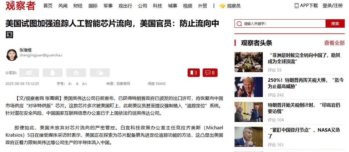 美国这是要把芯片变成 “间谍” 啊!一边往销往中国的人工智能芯片装追踪器,一边还大言不惭 “就怕流到中国”。 7 月 31 日深夜,英伟达上海办公室的灯亮得刺眼,国家网信办一纸约谈令,让这群高管坐立难安 —— 他们搞的 H20 芯片,正被中国监管部门像拆 "特洛伊木马" 似的层层解剖。 这场交锋背后,美国拿芯片当武器的荒诞戏码,正上演着最滑稽的反噬。 说起来这 H20 芯片真够讽刺的,被砍得只剩 H100 芯片两成性能,本是美国拿来卡脖子的,结果成了烫手山芋。 更可笑的是,美国议员还想给芯片装 "追踪器",没想到先让英伟达股价跌了 16%,专家一拆才发现,这芯片里的定位模块能精准锁位置,远程一关,整个 AI 系统就瘫了。 这哪是卖芯片?分明是想把中国的金融、城市系统变成美国手里的 "人质",有自动驾驶工程师吐槽:"这要是在高速上被远程锁死,比恐怖袭击还吓人!" 美国这禁令简直是搬石头砸自己脚,英特尔刚裁了 1.5 万人,中国市场收入就跌了 40%;英伟达想紧急加订 30 万片 H20,台积电早把生产线改做别的了,重启得等 9 个月。 《华尔街日报》都看不下去,说黄仁勋在北京谈笑风生时,硅谷投资者正算着 55 亿美元的损失。 更滑稽的是,美国一边禁售,一边又允许 "设备租赁",这种掩耳盗铃的把戏,连中学生都骗不了。 反观中国这边,禁令反倒逼出了狠劲,华为昇腾 910B 芯片出货量暴涨 230%,中芯国际 7 纳米产线 24 小时连轴转,晶圆加价 40% 还抢不到。 国产设计工具也突破了 7 纳米技术,华大九天订单翻了三倍。最戏剧性的是自动驾驶领域,有家车企原本靠英伟达,禁令一出,工程师两周就换成了国产芯片,成本还降了 15%。 他们 CEO 说得解气:"美国人以为我们会求饶,结果自己先慌了!" 现在的局面越来越荒诞:中国企业把阉割版 H20 用到极致,训练出的 AI 模型比美国的还强。 美国官员忙着给芯片装 GPS,自家半导体市值半年蒸发 1300 亿美元;当他们还在做 "技术铁幕" 的梦,中国 "东数西算" 工程已经建成全球最大算力集群,把封锁甩在了身后。 那些被 H20 折腾的美国企业终将明白,科技全球化时代,用政治手段拆产业链,最后那把刀只会插在自己胸口。
