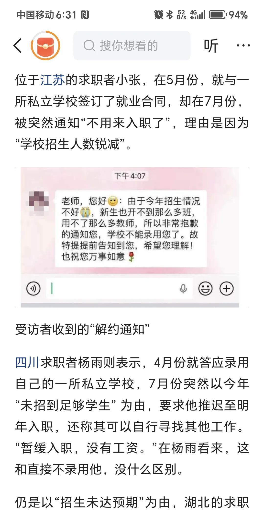 招生不足,新聘任教师遭单方毁约。 生育率不足造成的影响已经显现了,多所私立学校招