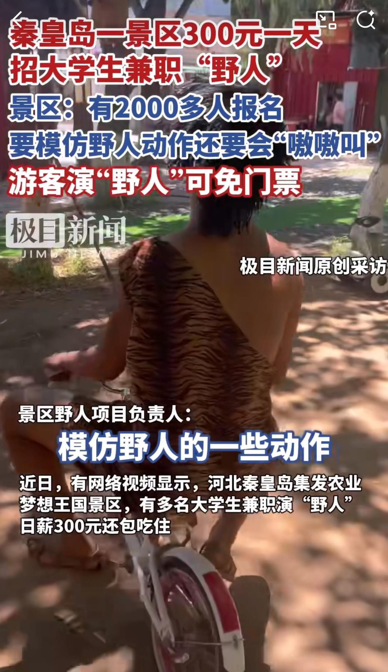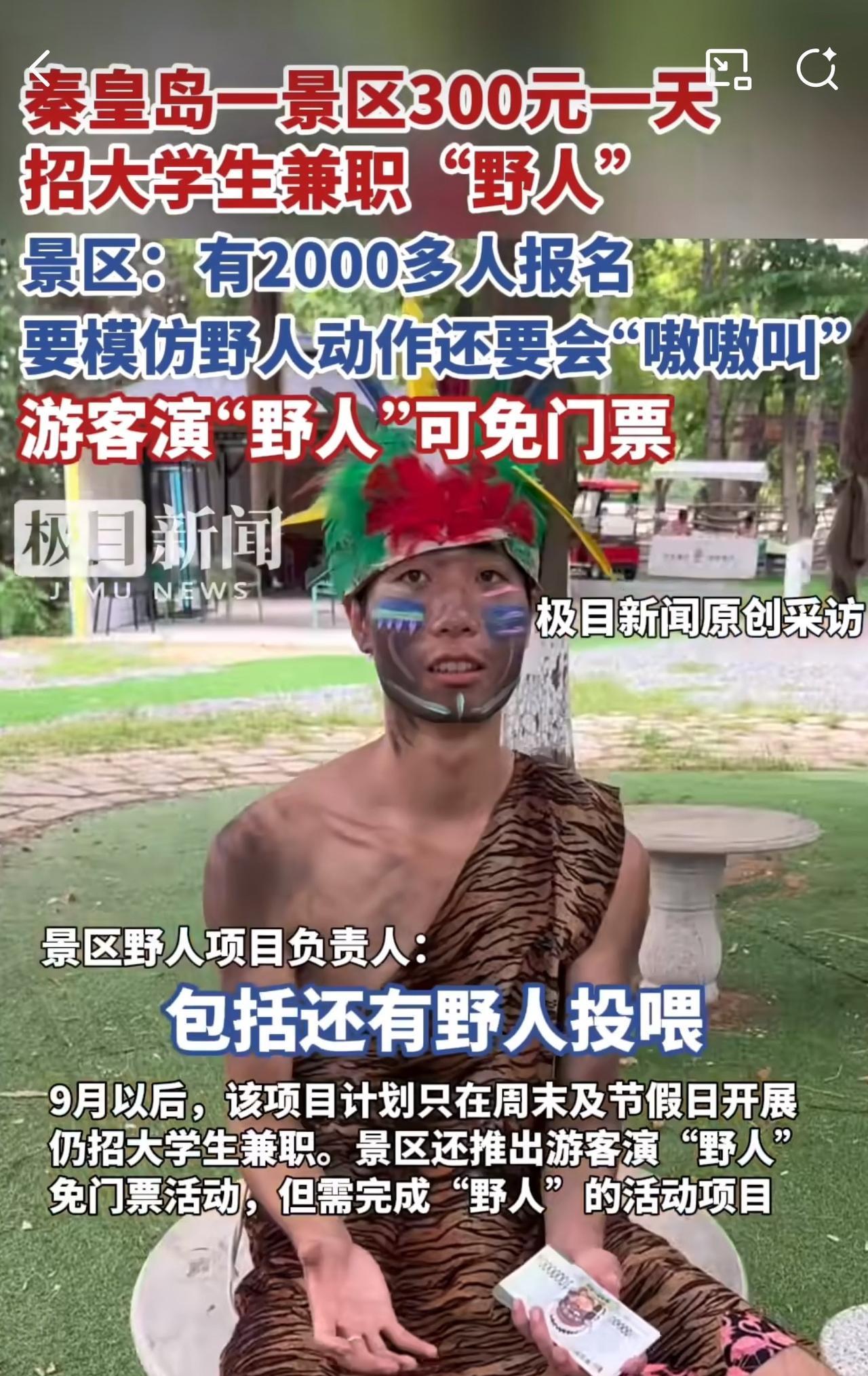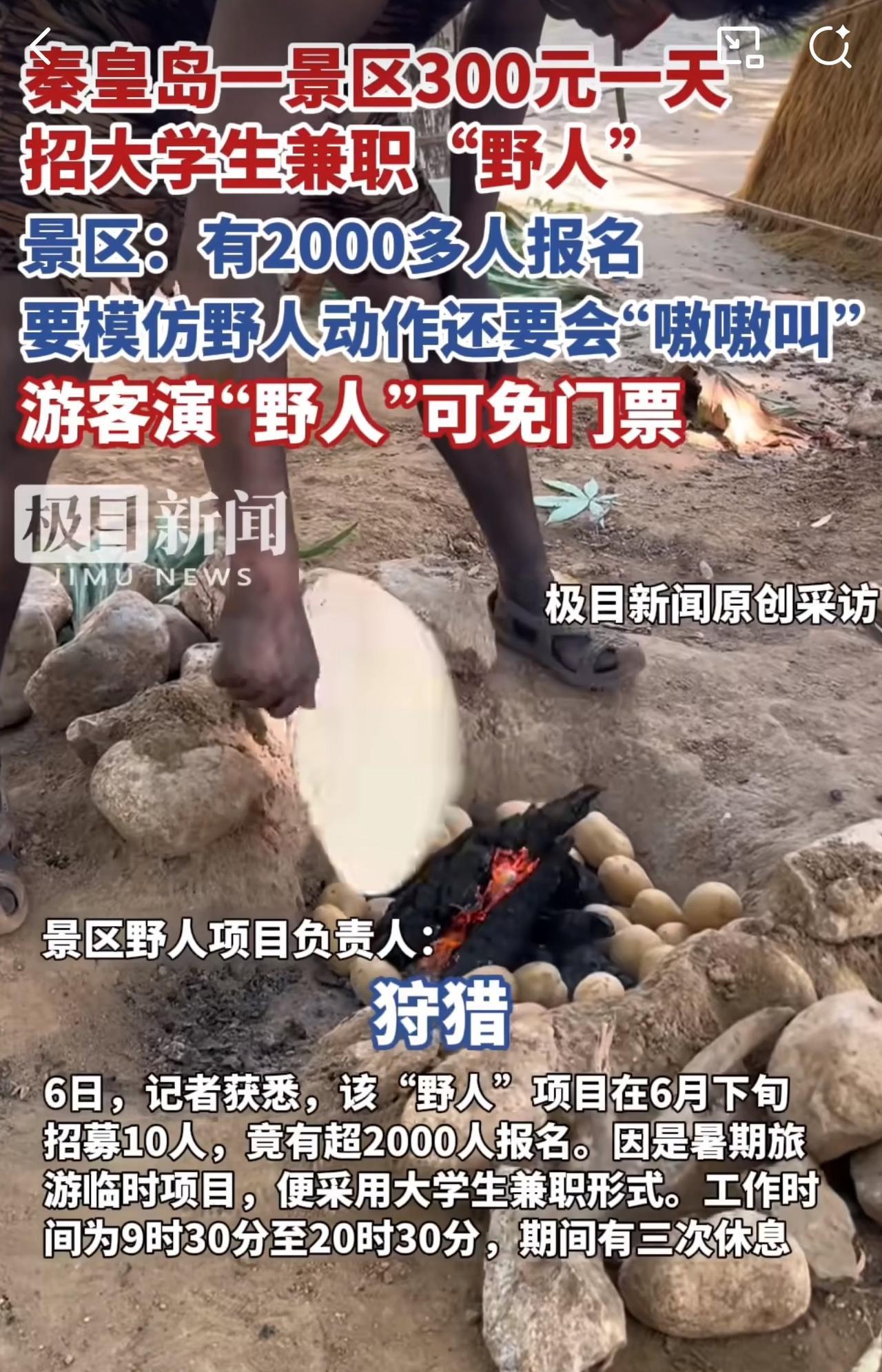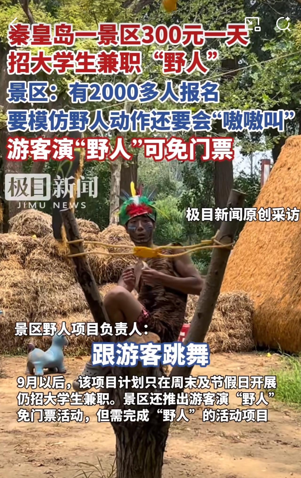 #MCN双量进阶计划#“真行!300元一天招大学生兼职野人!”近日,河北秦皇岛一景区多名大学生兼职演“野人”,300元一天包吃住。其中,招募时2000多人报名,最终招了10名大学生兼职演“野人”。 据悉,招募这些大学生兼职演“野人”,主要是从事表演活动,包括学“野人”叫、砖木取货、爬树以及烤地瓜和跳篝火舞等10余个内容,需要有一定的体力和应变能力。 针对此情况,有记者采访了其中一位大学生,这位大学生说:“他是7月5日“上岗”的,已经坚持了一个月,演“野人”既好玩还能挣钱,他计划一直演到开学!” 看到秦皇岛景区300元一天招大学生兼职演“野人”,2000多人争抢10个岗位,周少想说着实让人意外又觉得有趣。如今就业竞争激烈,暑期兼职选择不少,可这份工作却脱颖而出,足见其独特魅力。 从大学生角度看,300元一天的报酬不错,还包吃住,既能在暑期赚钱,又能体验新奇工作,对不少渴望尝试新事物的大学生来说极具吸引力。 从景区角度讲,利用大学生的青春活力与创造力,为“野人”项目注入新鲜感,也成功吸引了大量游客,提升了景区人气和收入,堪称双赢。 当然,这背后也反映出一些问题,大学生就业选择倾向与社会传统就业观念的碰撞。过去人们觉得大学生应从事“高大上”工作,如今却热衷这类看似“奇葩”的兼职,这是大学生就业观念的转变,还是社会就业环境的无奈之举? 不过话说回来,要是让你去扮“野人”,每天又蹦又跳还得跟游客互动,你能坚持下来吗?#寻美三湘# #长沙新朋友#