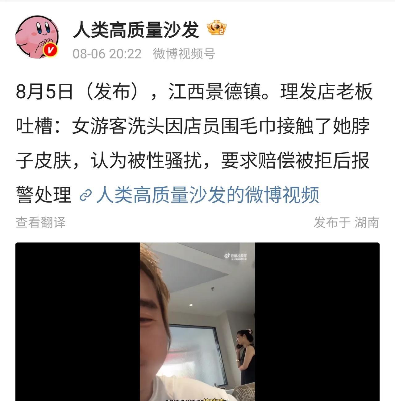 啥生意都不好干啊。 景德镇有理发店老板发文吐槽,说女游客洗头的时候就因为电源为毛巾触碰了她脖子皮肤,就直接被报警性骚扰。 我看了一下视频,十几分钟的画面里,女游客嗓门特别大,一个劲冷的人大喊。 店主道歉也没用,听口气好像是女方对赔偿不满。 然后过来的民警和理发店老板都是一脸的无语表情。 谁能想到这年头开个理发店,还能遇到这样的事情? 这幸亏是理发,只要开个按摩,还不让人给告的赔死啊。