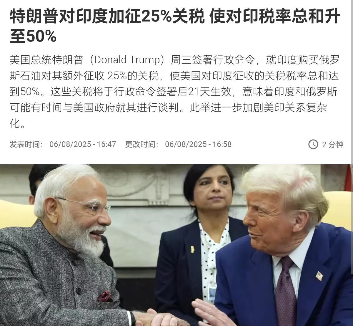 美国给了印度当头一棒!印度总理莫迪刚确认要访华参加上合组织峰会,特朗普一纸行政令宣布对印度加税25%!8月6日,根据法新社报道,就在莫迪确认访华之际,美国总统特朗普签署行政命令,就印度购买俄罗斯石油对其额外征收 25%的关税。而随着特朗普的这一宣布,这使美国对印度征收的关税税率总和达到50%。 很显然,莫迪刚宣布要访华,特朗普当天就签署加税行政令,这无疑是给莫迪政府来了一个当头一棒。当然,虽然特朗普签署了行政令,但是美国也不是没有留口子,事实上,特朗普的这一行政令签署后21天生效。也就是说,美国的刀已经举起来了,美国给了印度21天的考虑时间。 无疑,现在莫迪政府面临的压力非常的大。一边是与俄罗斯的关系,国家尊严,以及实实在在的经济利益,另一方面,则是占比19.78%的出口市场。美国当然也是看准了这一点,并以此拿捏印度。很显然,不管如何抉择,对于印度都是非常的困难的决定。这无疑是对莫迪的一次大考验。 #头号创作者激励计划#